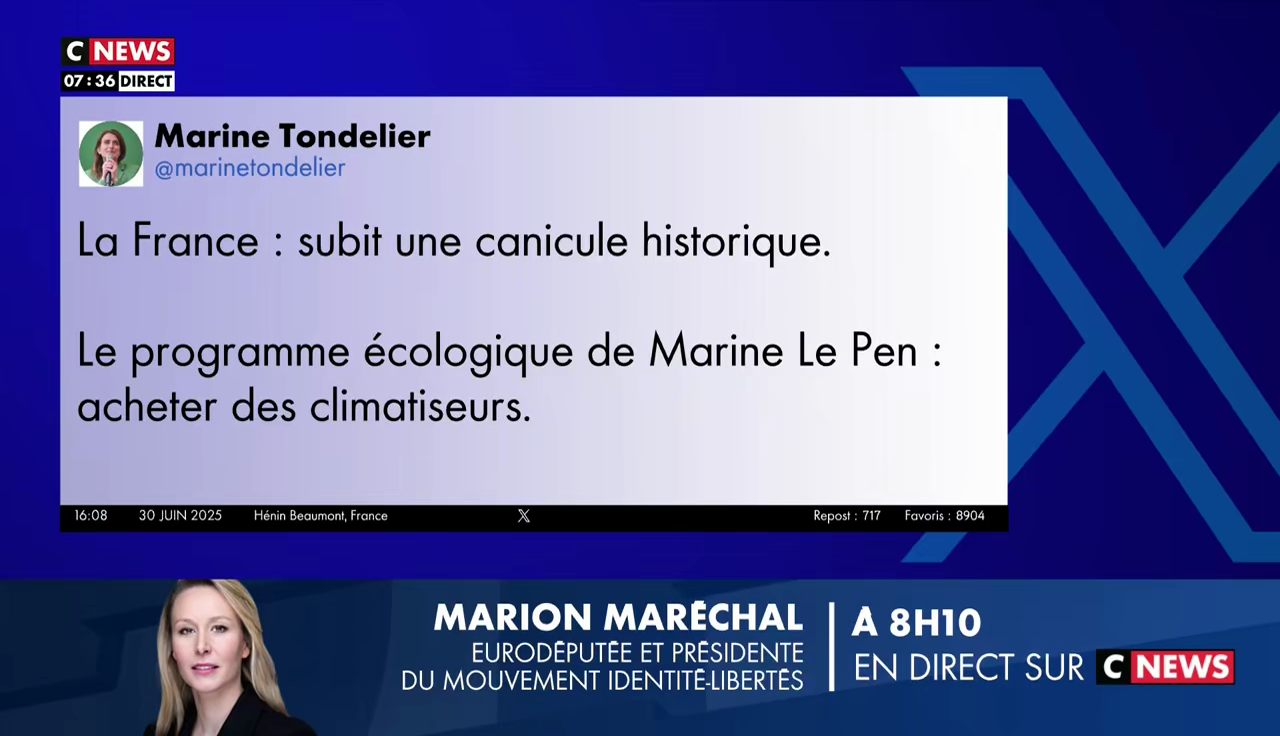 Lors de cette phase de canicule, Marine Le Pen a proposé un grand plan "climatisation" pour les services publics (écoles, hôpitaux, Ephad). Un peu court pour l'écologiste Marine Tondelier, laquelle a ironisé sur X :