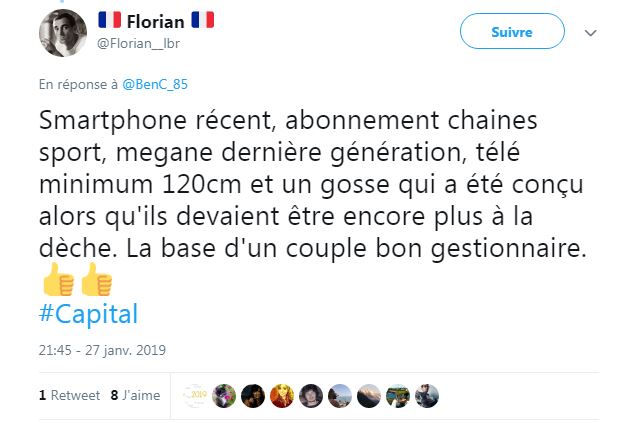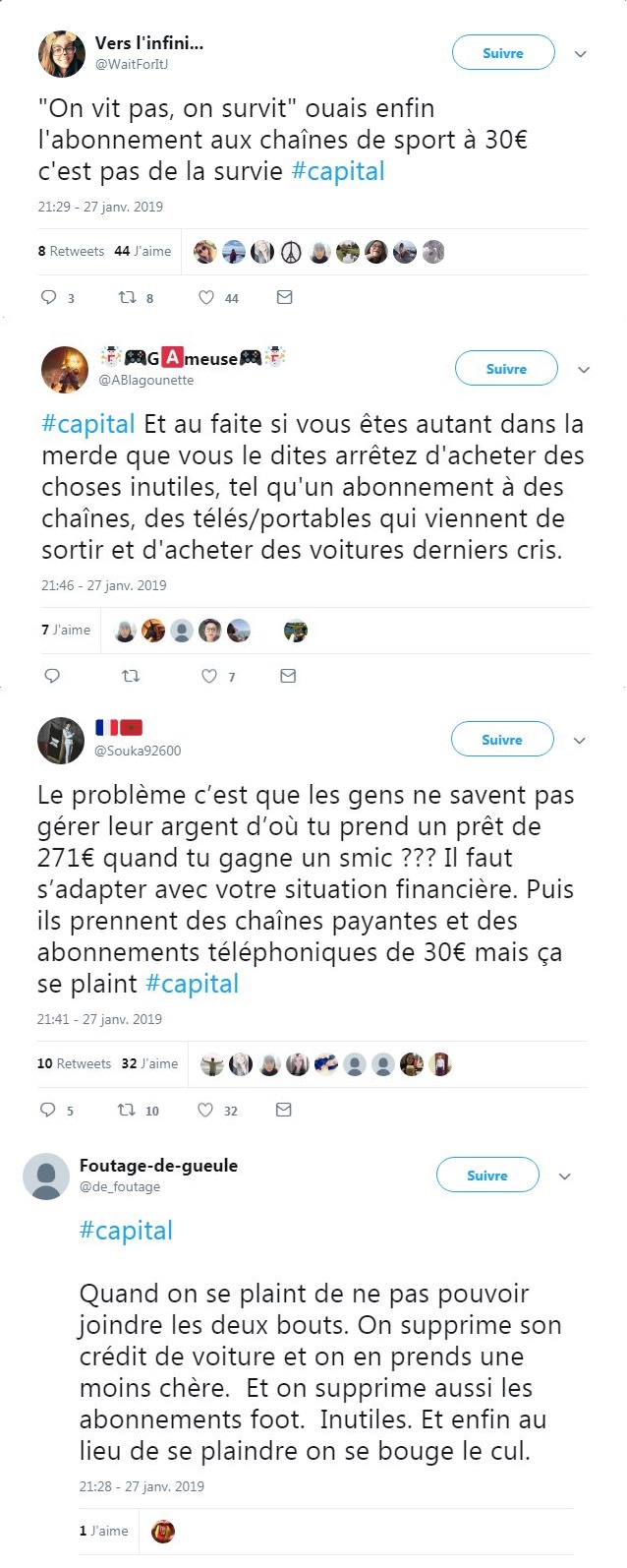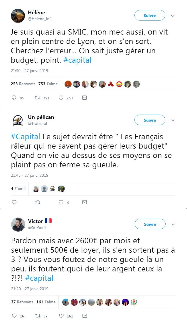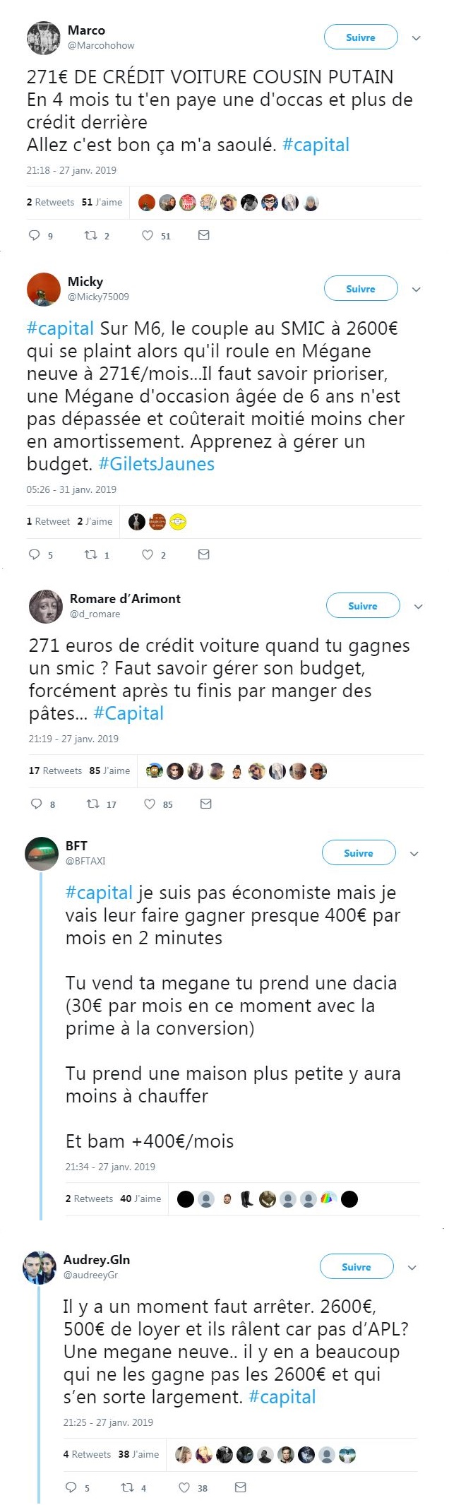 En visionnant ces reportages, on assiste à un curieux phénomène : de notre canapé on se met à débattre du bien fondé des choix des couples, “moi j’aurais privilégié les yaourts”. Et ça va très loin. Sur le cas de Justine et Florian de M6 (notre couple plombé par le fuel mais qui est abonné aux chaînes sportives et rembourse un crédit voiture), Twitter s’est déchainé :