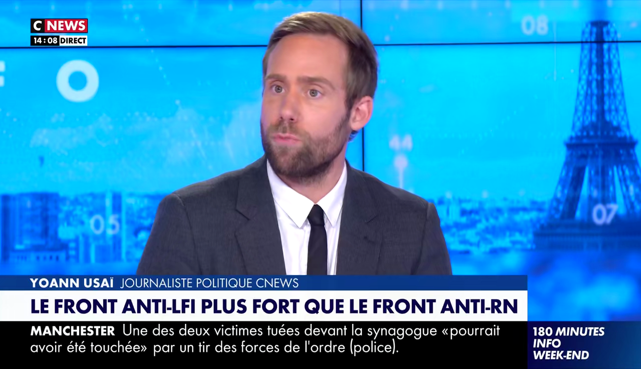 Autant dire que ces chiffres ont libéré les éditorialistes de la chaîne, qui n'avaient pourtant pas besoin de ça pour se déchaîner contre LFI. Exemple ? Pour Yoann Usaï, "cela signifie que les Français ouvrent progressivement les yeux. (...) Ils disent majoritairement qu'ils ne veulent pas à la tête du pays un parti antisémite, un parti allié avec les islamistes, un parti immigrationniste qui prône le grand remplacement."