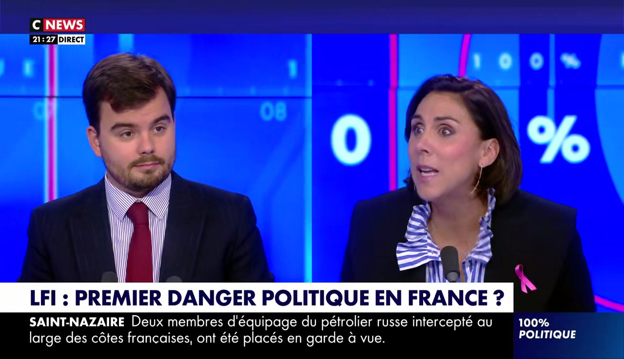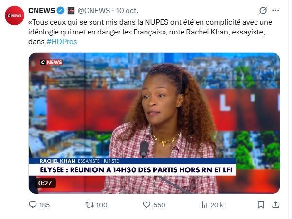 Pour celles et ceux qui connaissent un peu Rachel Kahn, cette éditorialiste plus à l'aise à l'écrit qu'à l'oral (surtout quand elle plagie), le propos vise La France insoumise. Une semaine plus tôt, sur la même chaîne, elle avait davantage développé sa pensée : "LFI est un danger pour la France et pour notre République. C'est un parti qui est pro-Hamas, qui est dans la propagande et le porte-parolat des terroristes (...) qui met des cibles dans le dos des citoyens, notamment des Français juifs, (...) qui est dans le racisme, le communautarisme, l'entrisme, qui est contre la police, (...), contre les institutions et contre l'autorité et qui est pour la violence"