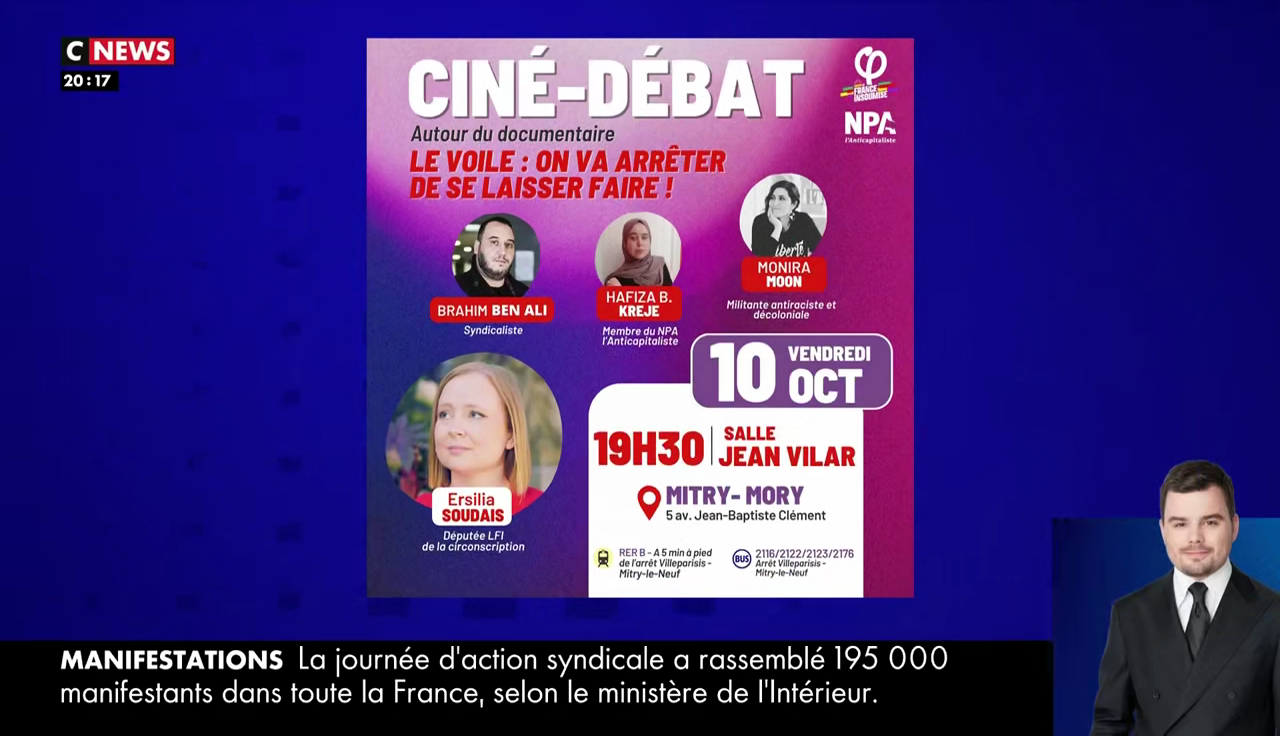 Sur CNews, le travail de sape contre LFI est quotidien. Avec toujours la même méthode : la moindre info sur les Insoumis est scrutée et transformée en débat national. Exemple ? Le 4 octobre, CNews a une info de dingue : un ciné-débat est organisé à Mitry-Mory, une immense mégalopole de 20 000 habitants située en Seine-et-Marne. Le thème ? "Le voile, on va arrêter de se laisser faire"