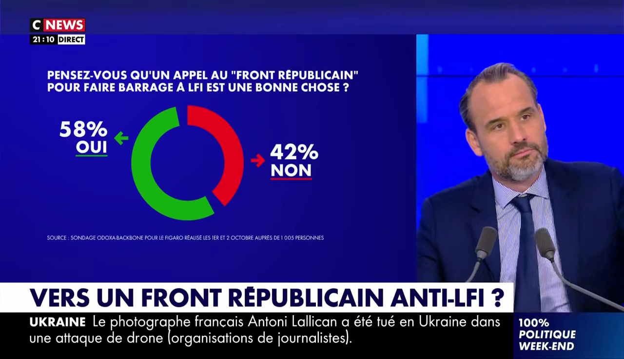 va saisir l'occasion pour commander le fameux sondage à Odoxa. Oui, la chronologie est implacable : le 30 septembre, Karoutchi fait cette annonce, et les 1er et 2 octobre, Odoxa sonde 1005 Français sur internet (mais dans le strict respect des quotas évidemment). Et voilà comment CNews a pu mouliner pendant toute une journée sur ce nouveau front républicain en reprenant un outil utilisé historiquement pour faire barrage à l'extrême droite. Un vrai tour de force qui récompense les efforts de la chaîne depuis des années.