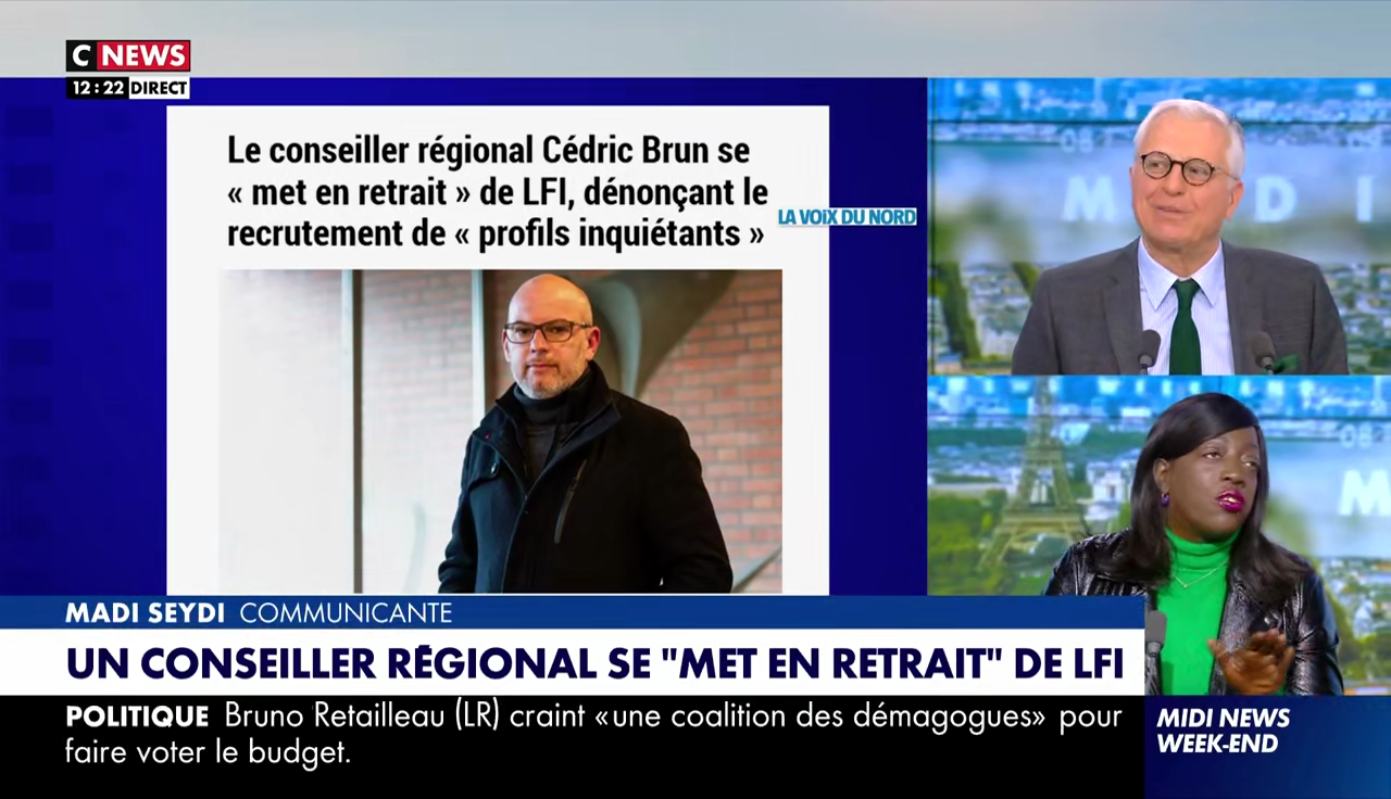 publie le témoignage d'un élu LFI, un certain Cédric Brun. Celui-ci vient de démissionner du conseil régional sous prétexte que le parti aurait des accointances avec les Frères musulmans. LFI et islamisme ? Le cocktail rêvé pour les éditorialistes de CNews qui relient quelques jours plus tard ce désistement d'un élu local au sondage du Figaro