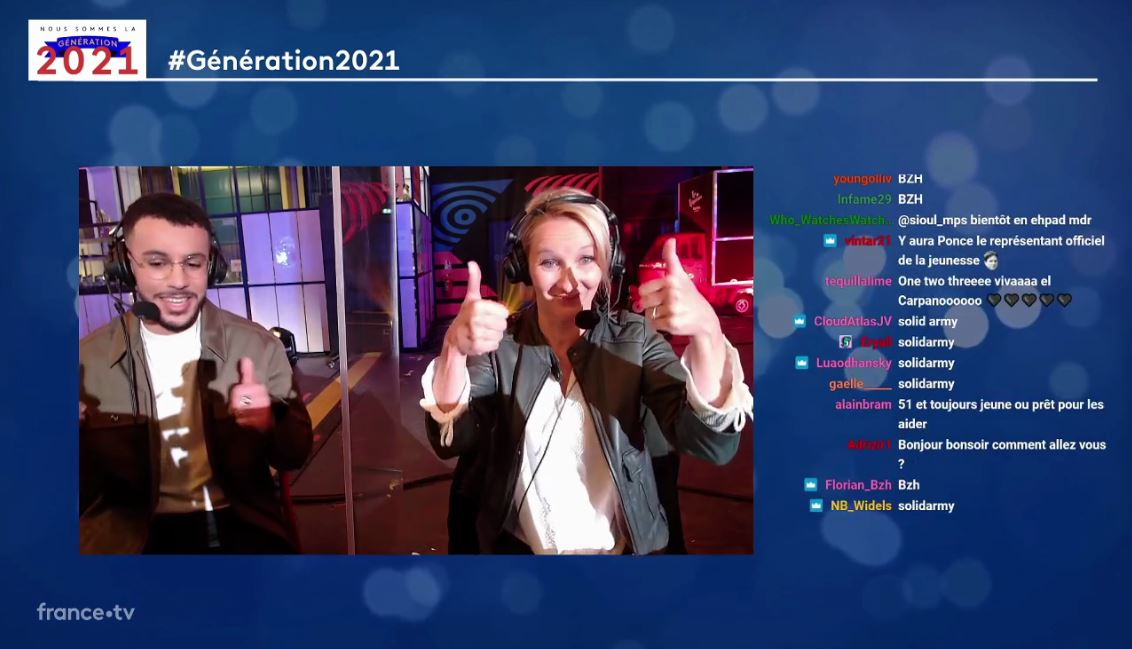 Un décalage qui donne des séquences un peu lunaires. Exemple ? Au début de la soirée, la journaliste-twitch intervient sur l’antenne de France 2 et laisse son invité meubler le live. On vous laisse découvrir cette séquence popcorn :