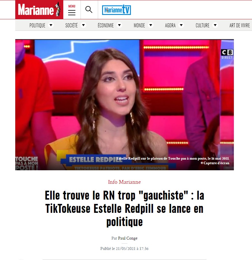 Même punition avec Estelle Redpill, invitée le 12 mai dernier pour débattre sur l’opportunité, ou non, de diffuser dans la presse le visage d’un meurtrier présumé. Voilà comment Hanouna la présente : "Estelle Redpill, Tiktokeuse, patriote et fan numéro un d’Eric Zemmour. Merci d’être là. Ça fait longtemps qu’ils veulent vous inviter, dans mes équipes."