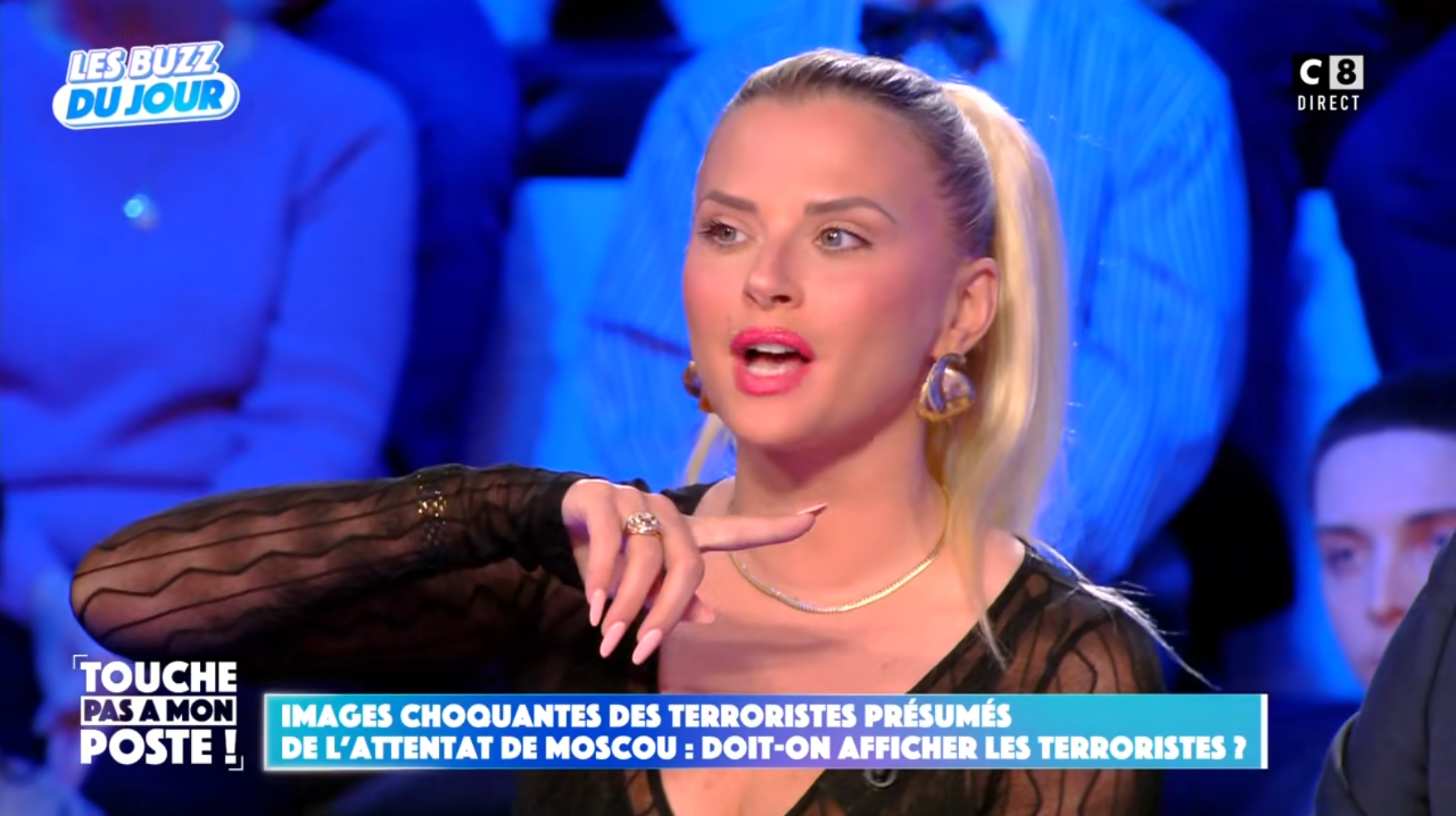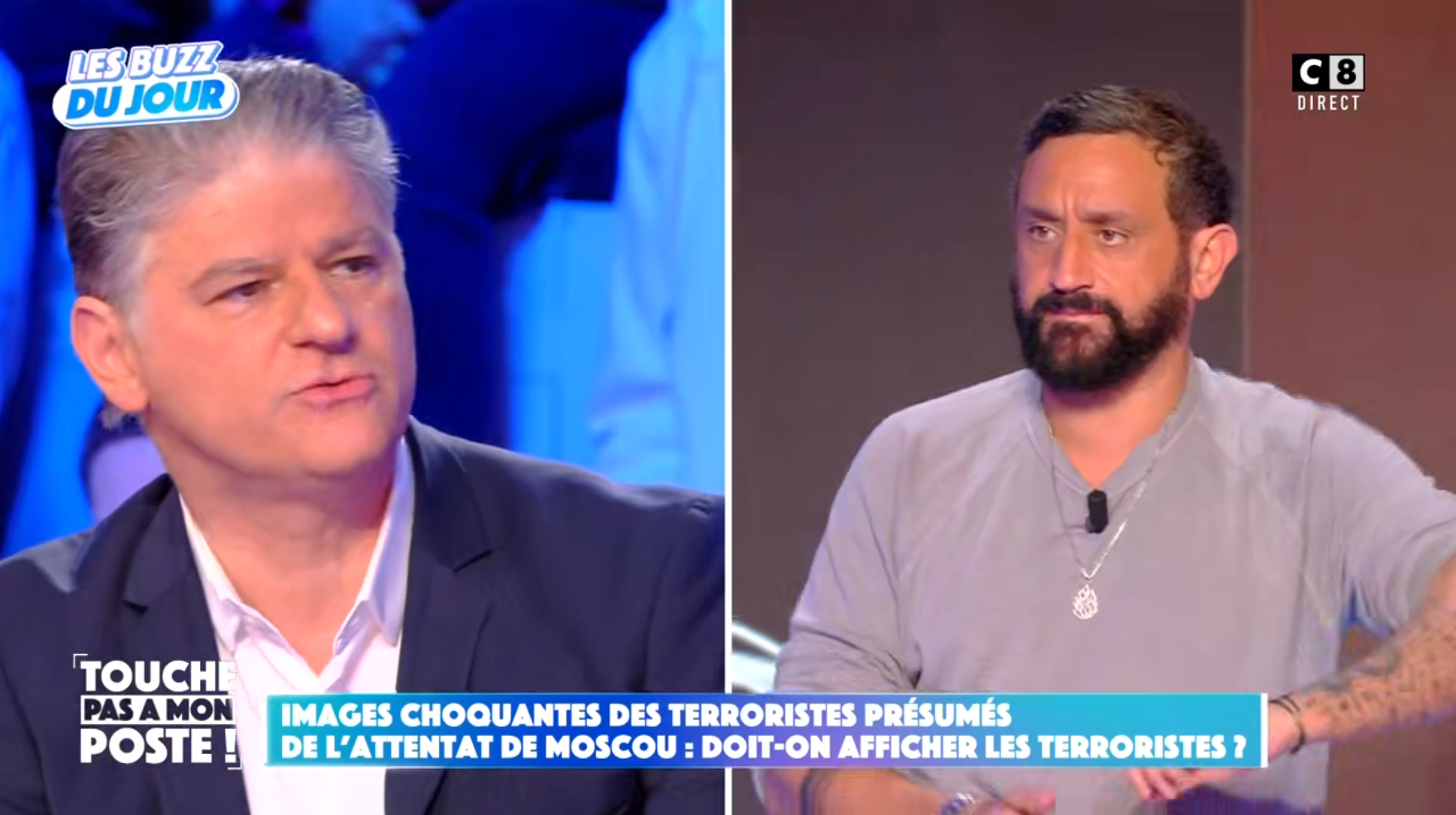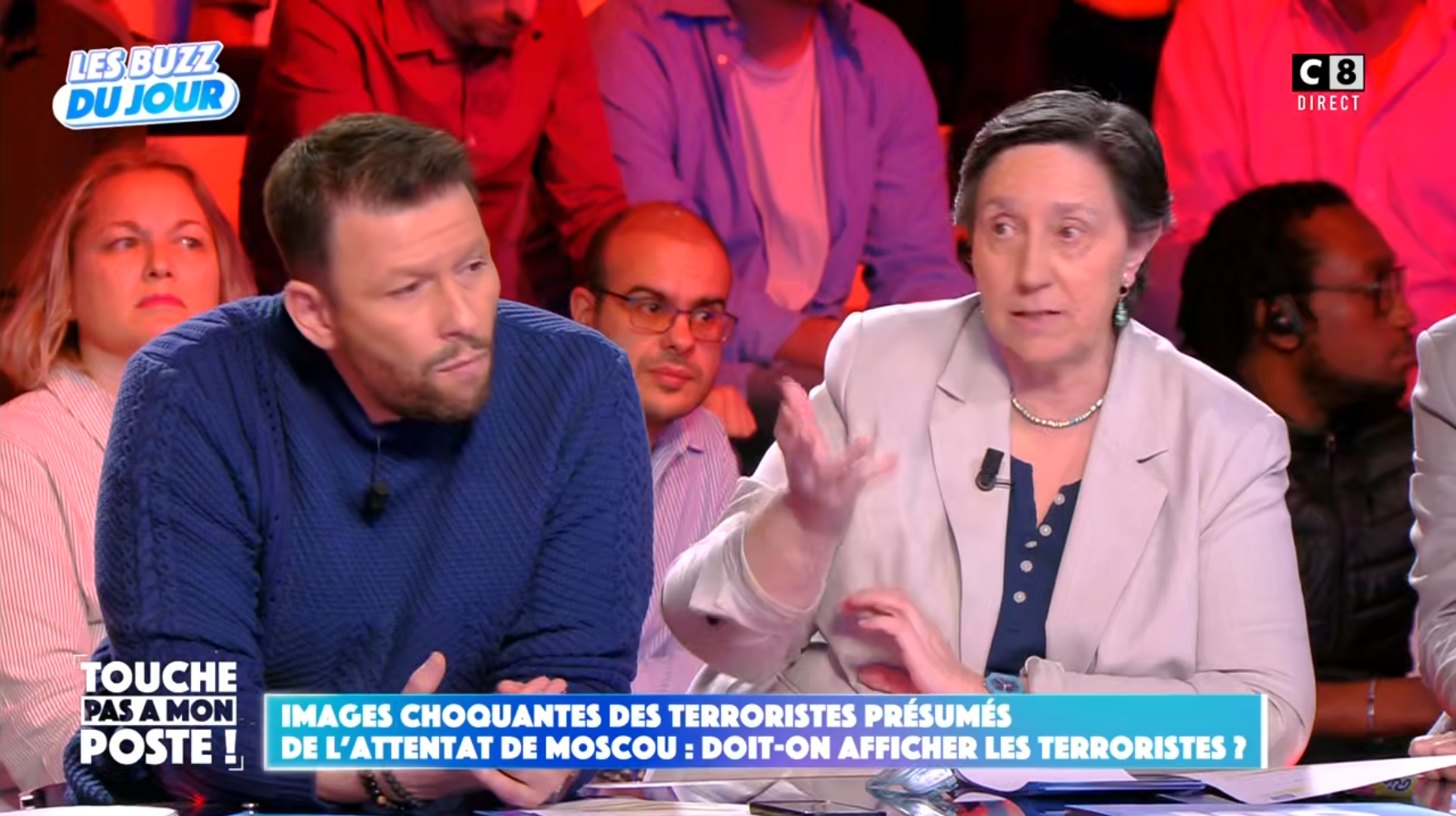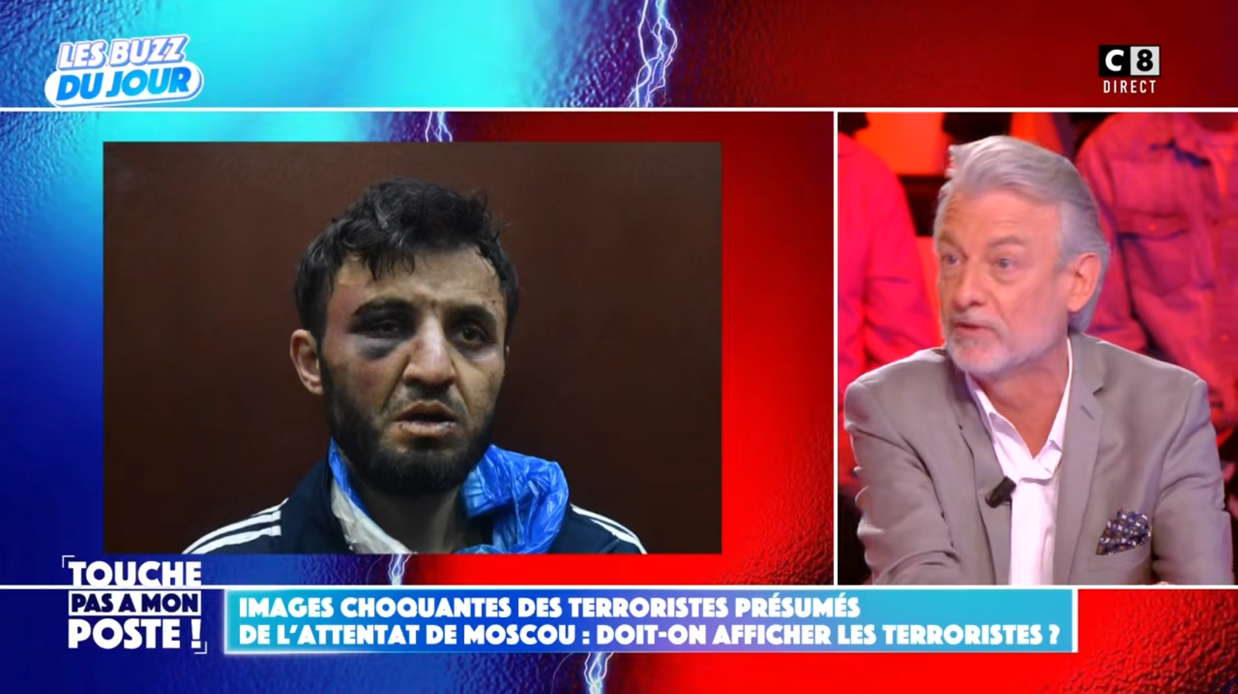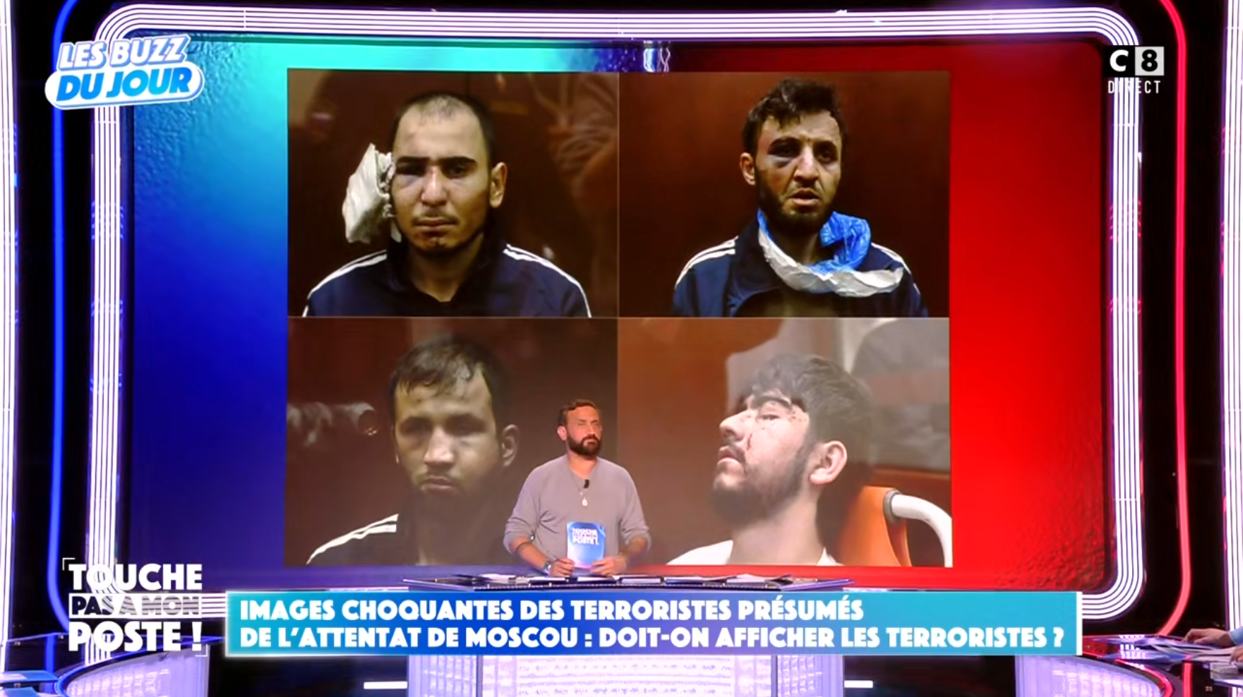 Trois jours après l'attentat contre la salle de concert Crocus City Hall près de Moscou le 22 mars, qui a fait au moins 144 morts, Hanouna lance un débat résumé ainsi en bandeau : "Images choquantes des terroristes présumés de l'attentat de Moscou : doit-on afficher les terroristes ?"
