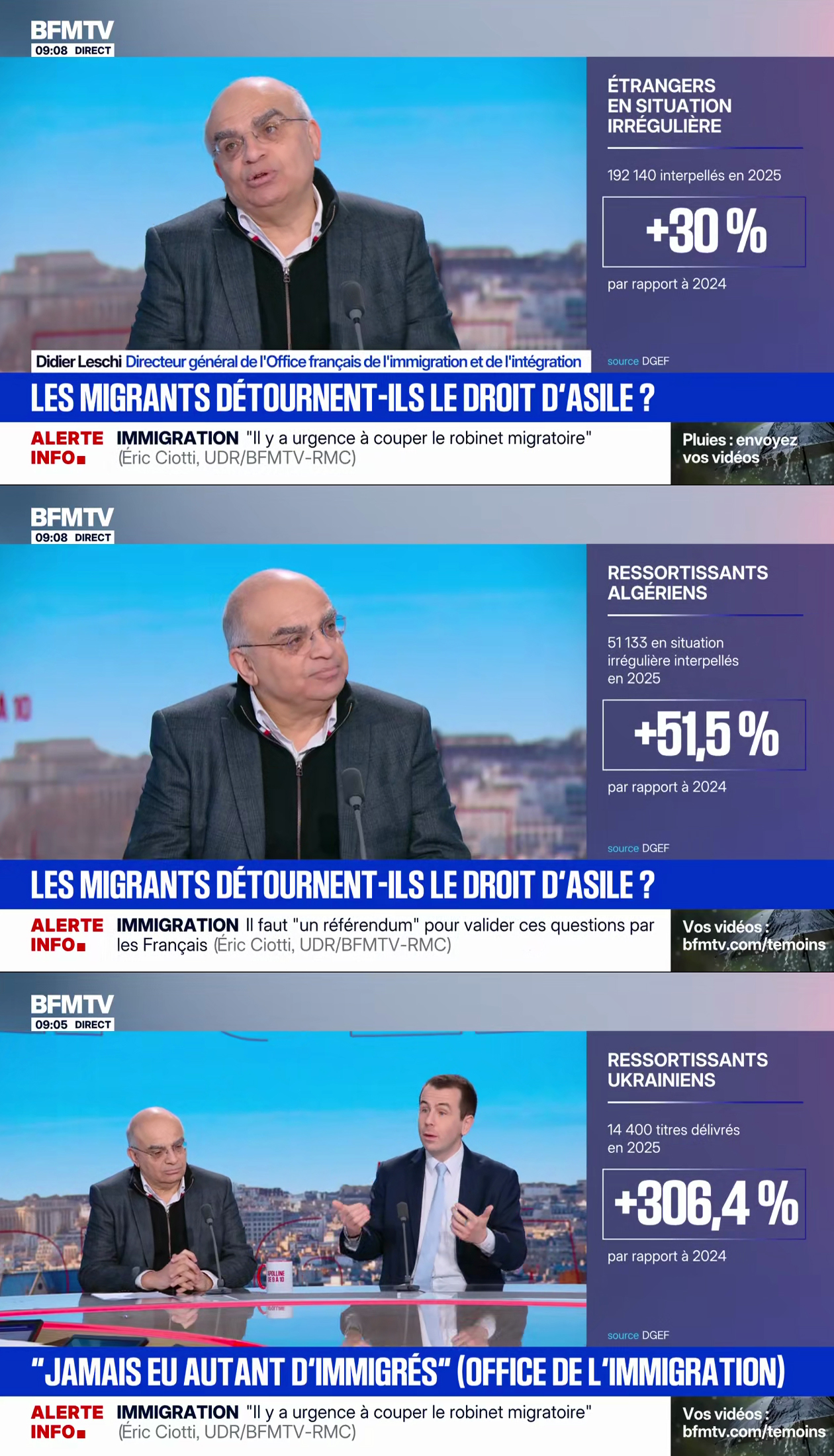 Et si le débat est si biaisé, c'est parce que lorsque Didier Leschi, l'alibi de gauche, prend la parole, il est très bien entouré par des bandeaux qui vont tous dans le même sens : "Jamais eu autant d'immigrés", "Les migrants détournent-ils le droit d'asile ?", "Droit d'asile : 90 % des migrants restent après un refus", "49 % des délinquants sont des étrangers"