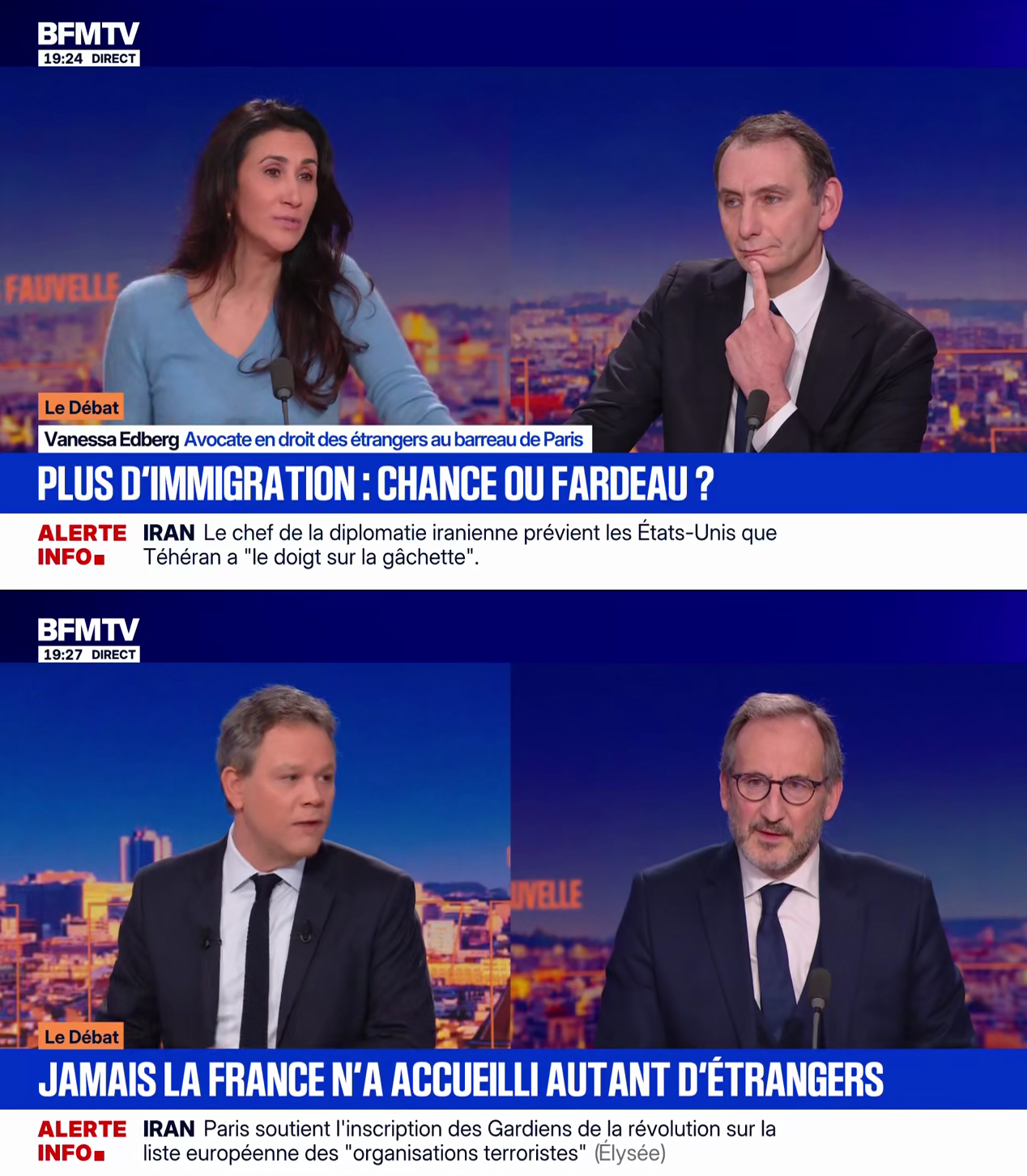Qui a-t-il invité ce soir-là pour débattre de l'immigration ? Laurent Jacobelli, député RN de Moselle et porte-parole du Rassemblement national et Vanessa Edberg, avocate en droit des étrangers. Mais pas que, il y a un troisième intervenant, Guillaume Tabard, rédacteur en chef au Figaro. C'est du deux contre un, et comme il fallait s'y attendre, ils ont eu deux fois plus la parole que l'avocate en droit des étrangers.