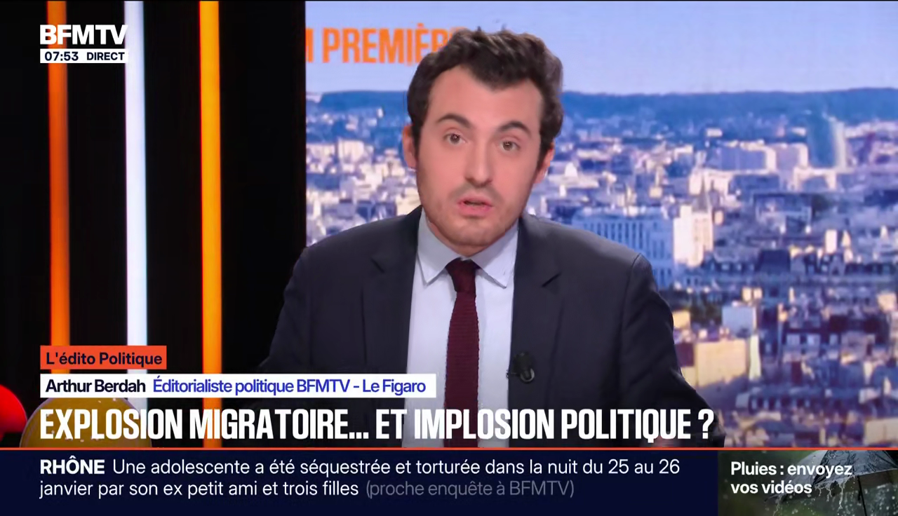 Ça hurle moins, on n'entend pas de propos racistes, mais les formats sont tout aussi biaisés. Dès 7 h 55, l'éditorialiste BFMTV - Figaro, Arthur Berdah, se réjouit que sur l'immigration, "les propositions fusent déjà en vue de la prochaine présidentielle avec un relatif consensus désormais sur le triptyque, moratoire, quota, référendum, consensus qui va des nationalistes lepénistes, ça on le savait déjà, jusqu'aux centristes macronistes et ça c'est la nouveauté. Mieux vaut tard que jamais."