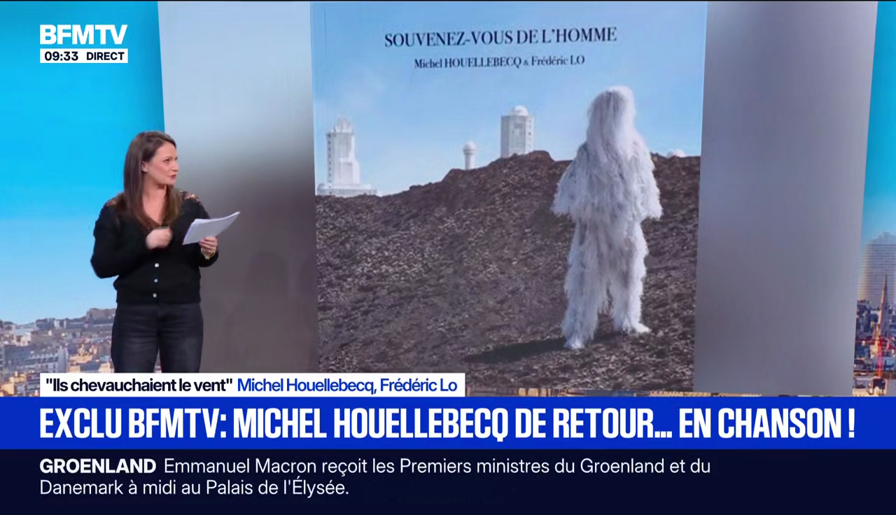 Ça va, vous tenez bon ? Pas trop démoralisé ? Allez, on continue la chronique en musique grâce à BFMTV. Du Sardou avec "Le Temps des colonies" ? Non… Houellebecq. Il sort un album.