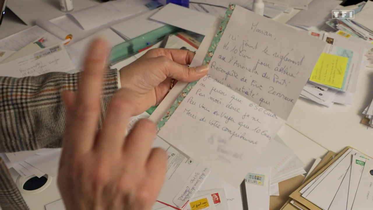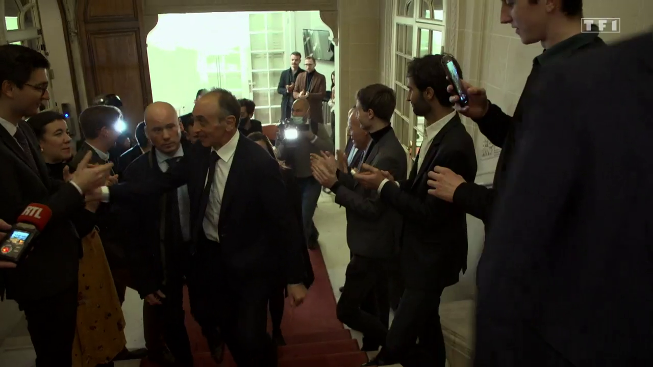 Quand TF1 évoque le financement de la campagne de Zemmour, les caméras ne ratent pas une marche montée par le conseiller qui apporte le courrier.