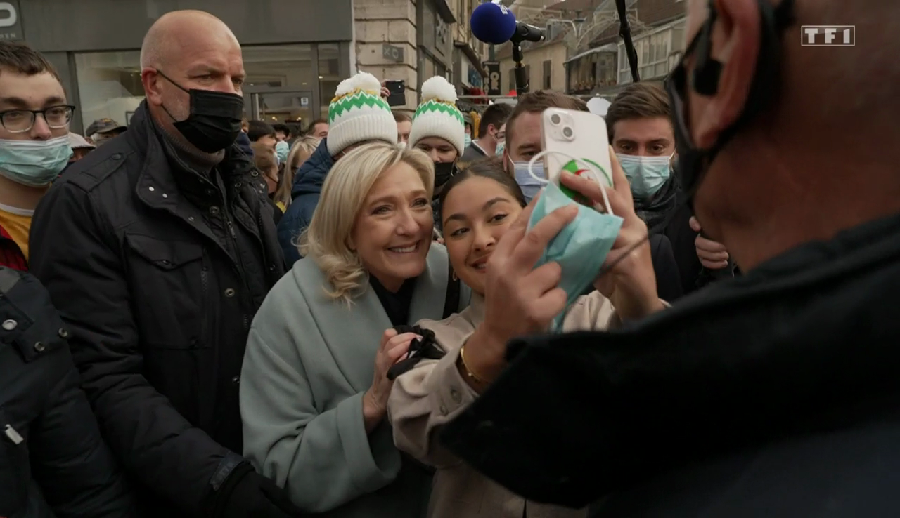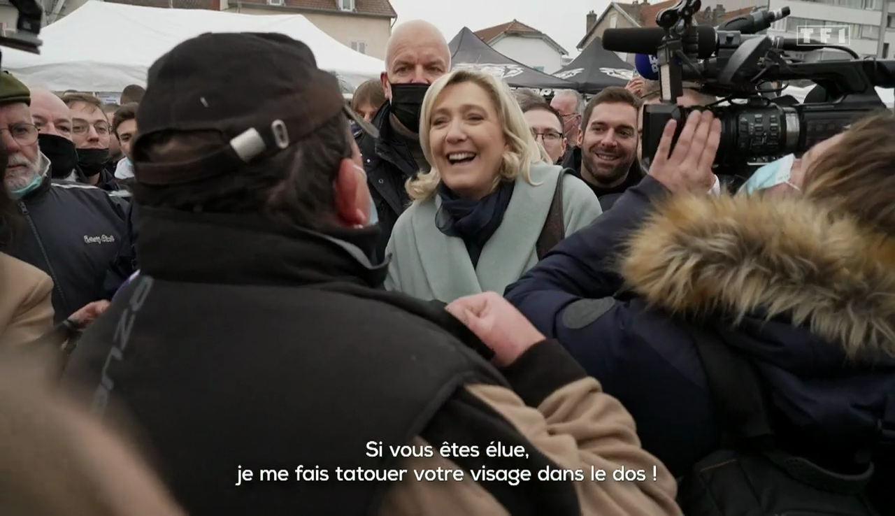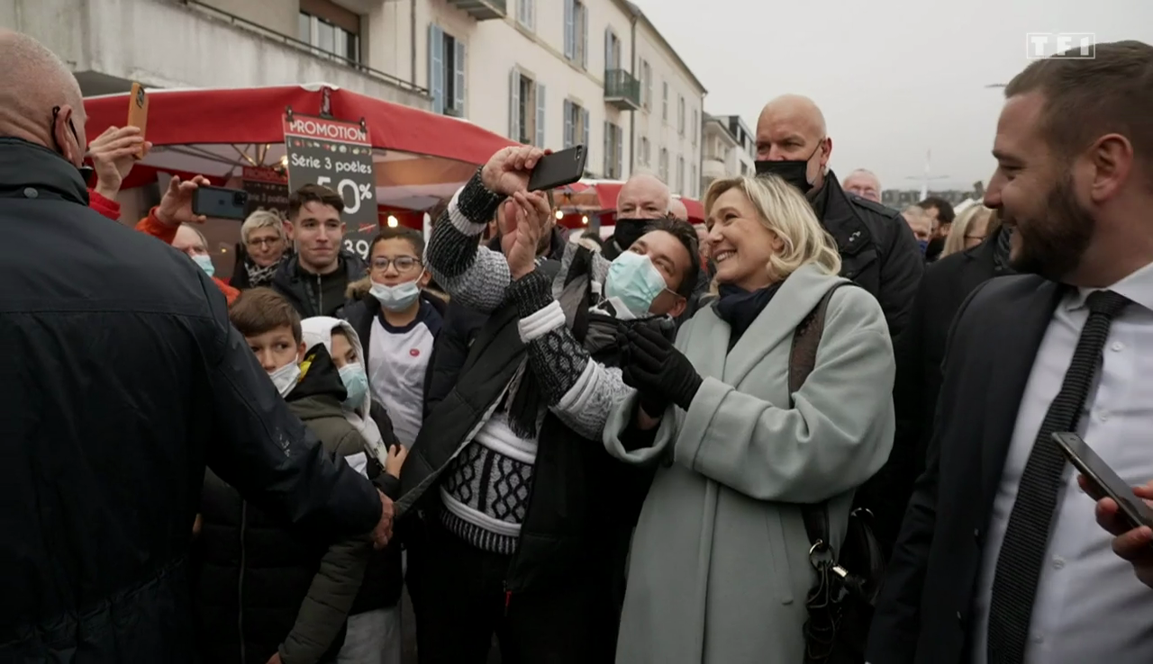 Conclusion de Le Pen, à un autre moment du tournage, devant le journaliste de TF1 : "C'est très plaisant de se déplacer comme ça. C'est objectivement plus plaisant d'être ici que dans les plateaux de télévision, c'est beaucoup plus sympa."