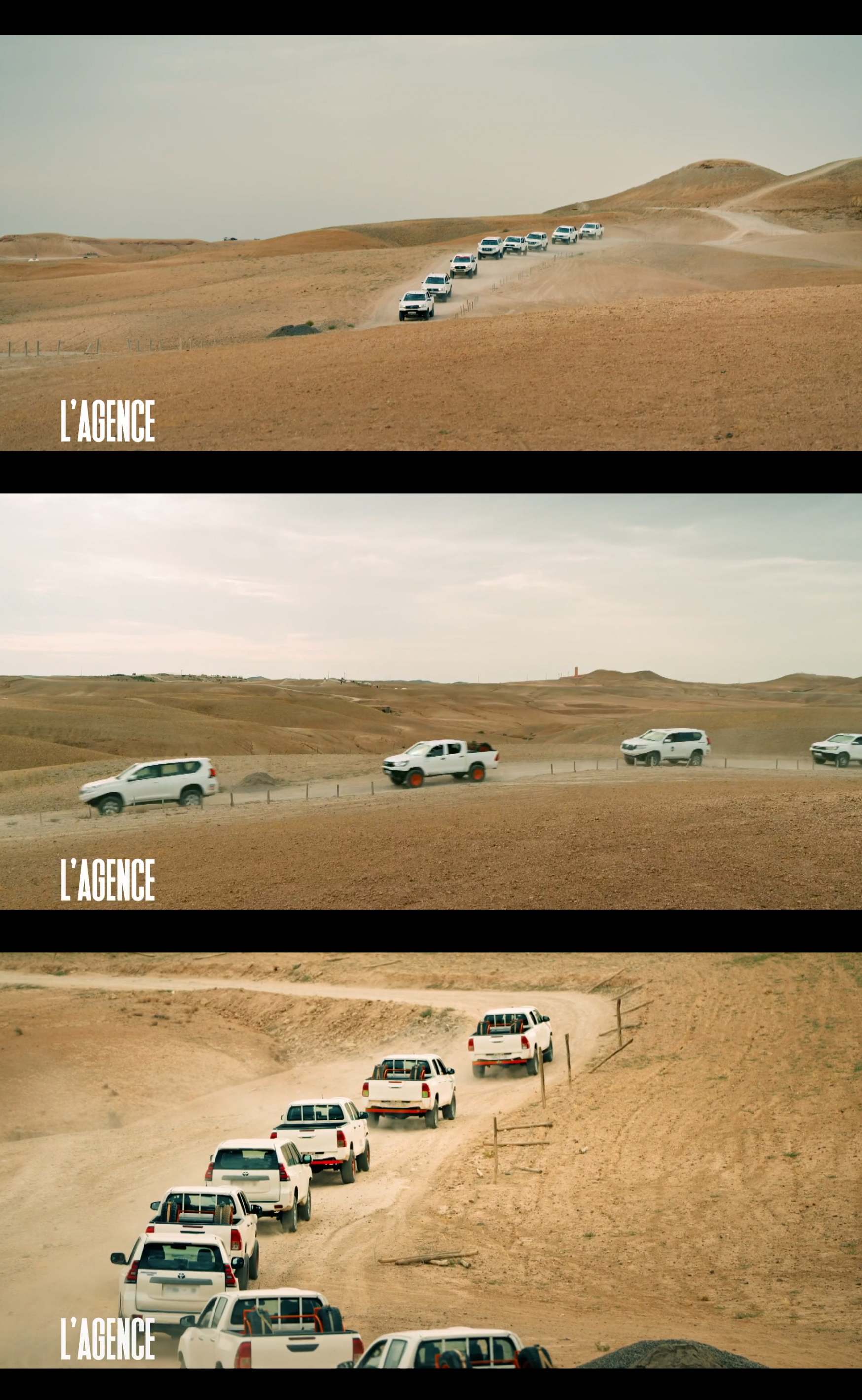 En ce lundi matin, c'est donc séminaire annuel dans le désert marocain. Pour se rendre sur les lieux, ils n'y sont pas allés à dos de chameau (ça, c'est pour de la balade), mais dans un convoi de pickup, filmé avec des drones.