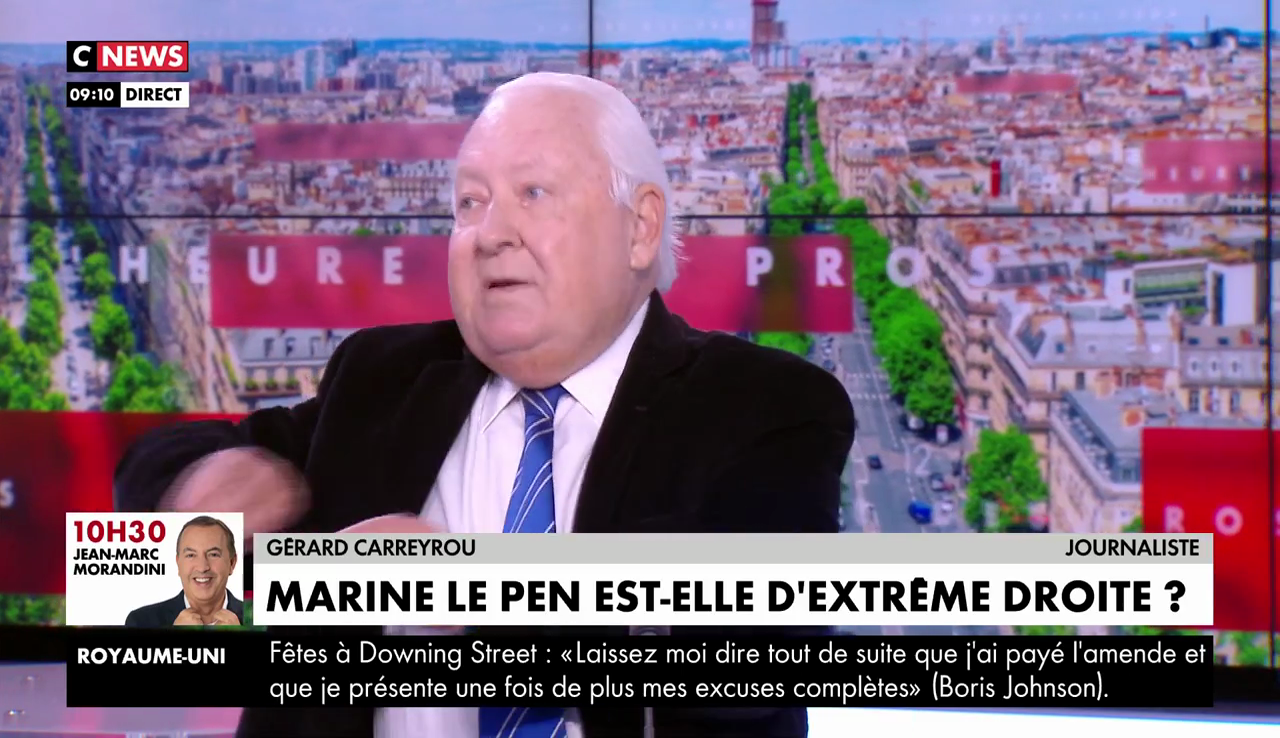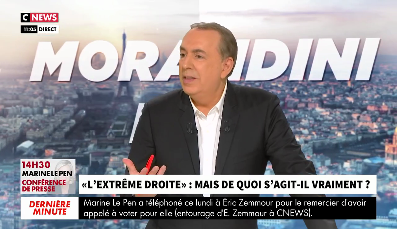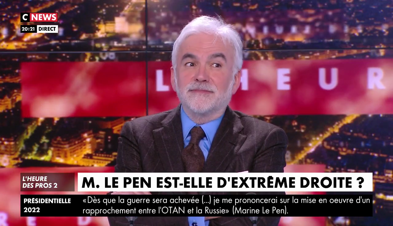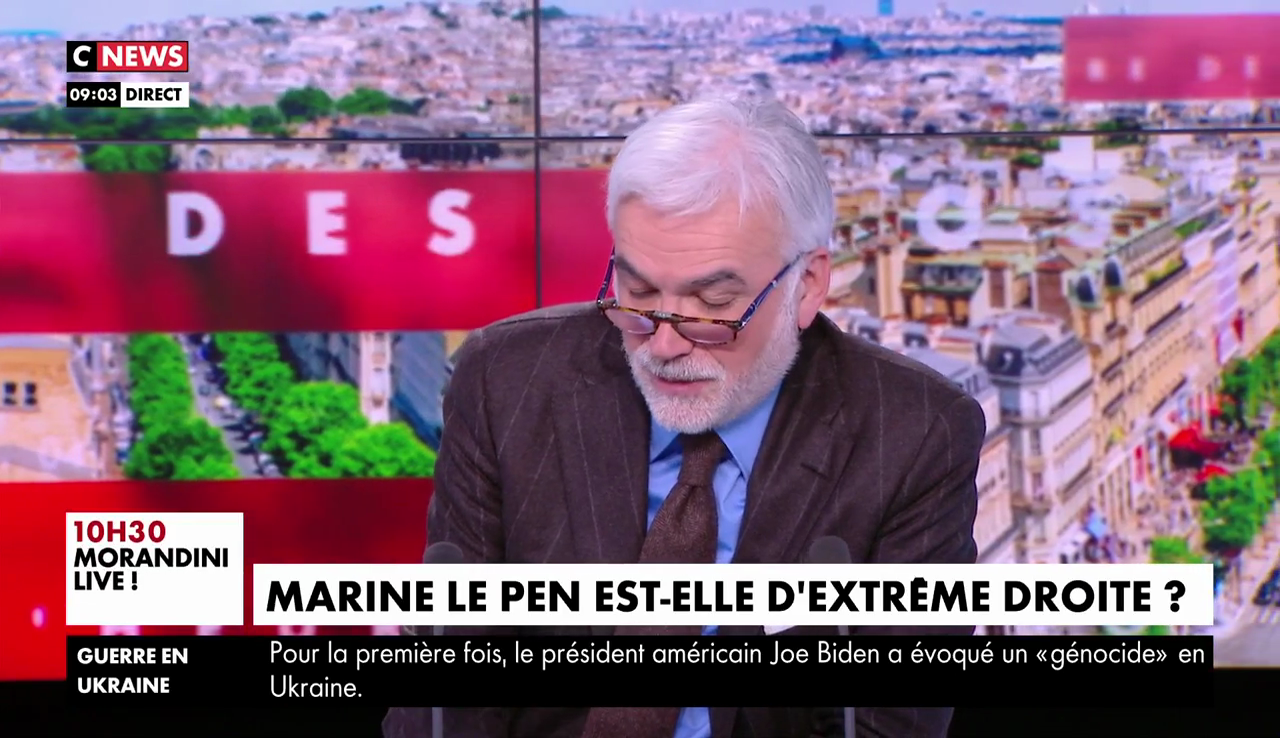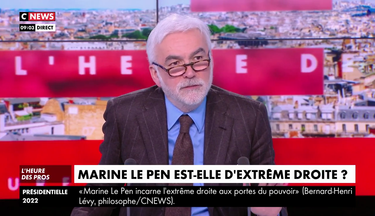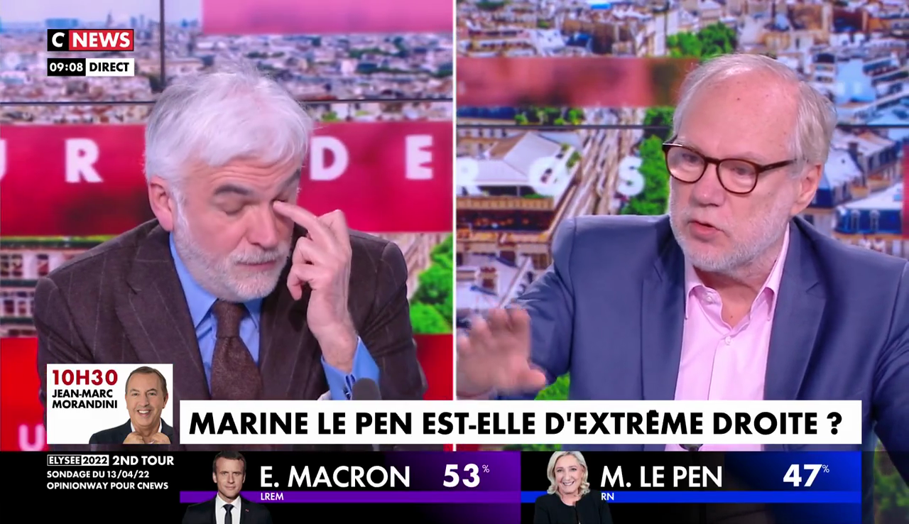 Du côté de CNews, chaîne orpheline de Zemmour, Pascal Praud est proche du burn-out. Le seul fait de pouvoir dire qu'elle serait d'extrême droite le rend malade : "Depuis dimanche, 20 h, Marine Le Pen incarne de nouveau le diable. Le chiffon rouge de l'extrême droite est brandi par Emmanuel Macron mais aussi par les soldats de la bonne conscience qui défilent dans l'espace médiatique, le cœur en bandoulière et la morale au bord des lèvres. […] Pour tout vous dire, je suis un peu lassé de ces postures. Je connais les fausses indignations, les colères sélectives, on éructe l'anathème à défaut d'argumenter."