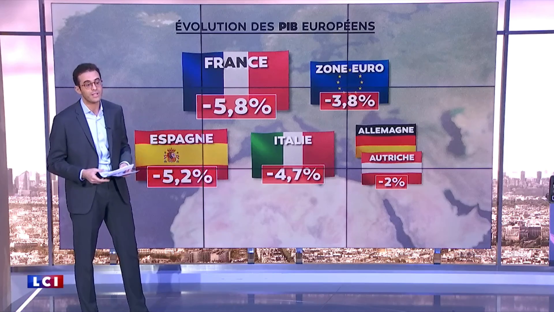 Si tous ces éditorialistes s'excitent sur la trouille des Français, c'est parce qu'il y a urgence : le PIB chute. Et la crise économique est plus importante chez nous qu'ailleurs d'après le panneau de LCI :