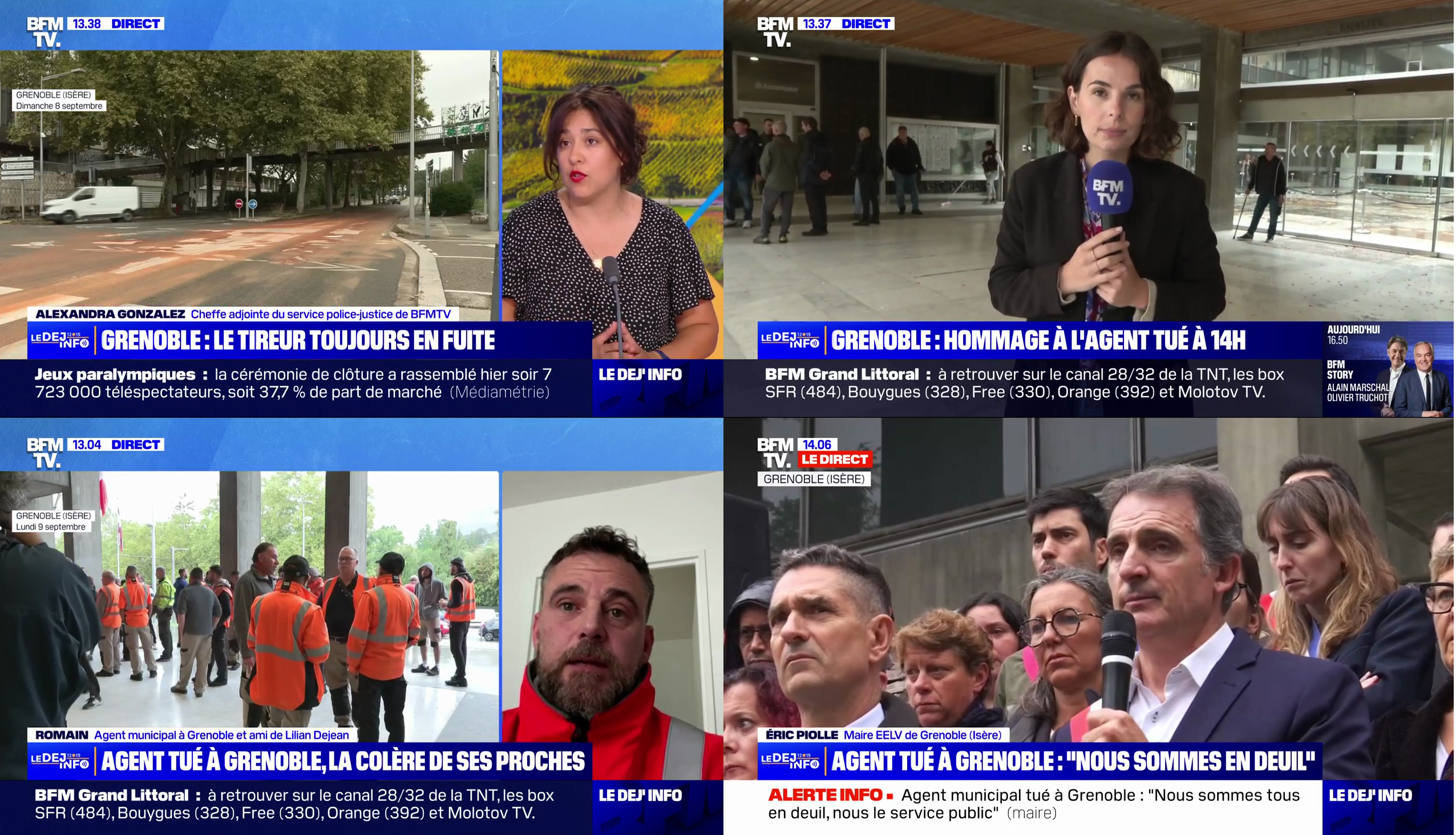 Quelques duplex dans l'après-midi, des témoignages de proches, un direct pendant l'hommage municipal : ce lundi 9 septembre, BFMTV accorde une grande place à un fait divers survenu la veille à Grenoble. Alors qu'il tentait d'arrêter l'auteur d'un accident de la route, un agent municipal de la ville, âgé de 49 ans, a été tué par balles. Le suspect, qui a pris la fuite, est "connu de la justice"