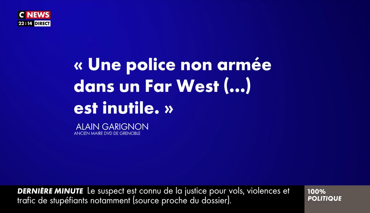 Désarmés ? En fait, ils ne sont simplement pas armés, l'actuel maire de Grenoble, Éric Piolle, ayant annulé la décision de son prédécesseur de fournir des armes aux policiers municipaux. Mais qu'importe. Pour Carignon, cette absence d'arme est une faute politique : "Le problème de ces politiques-là, ils ont une doctrine et ils ne veulent pas en varier. C'est dommage qu'ils ne veuillent pas s'adapter un tant soit peu à la réalité. Une police non armée dans un Far West, ça veut dire qu'elle ne peut pas sortir évidemment."