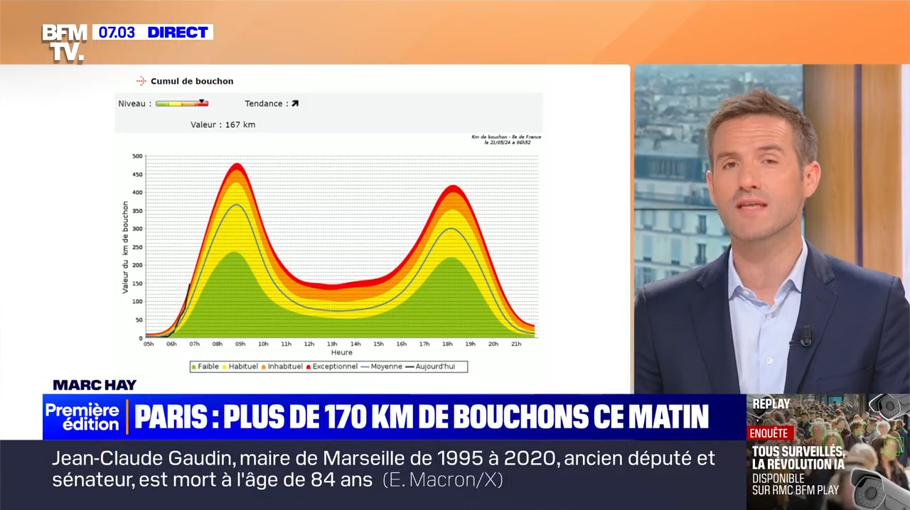 À chaque fois, le même procédé pour délégitimer un mouvement de grève : insister sur les conséquences négatives du mouvement social (et pas sur les causes, encore moins sur le bien fondé du mouvement). Par exemple, ce 21 mai, BFMTV a non seulement constaté qu'il y avait moins de trains, mais en plus, il y avait des bouchons sur le périphérique. Pour bien comprendre ce phénomène complexe d'une voiture qui ne peut pas avancer très vite à cause d'une voiture qui est devant, BFMTV a sorti un graphique (non explicité, mais les couleurs suffisent).