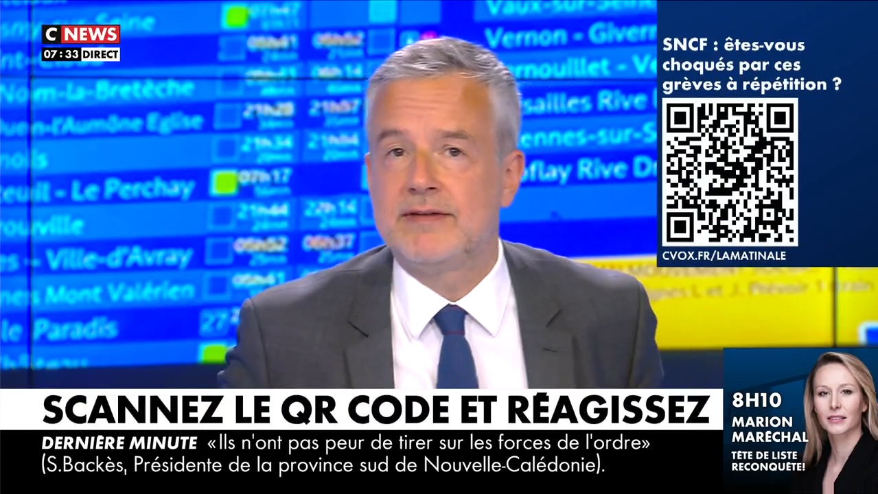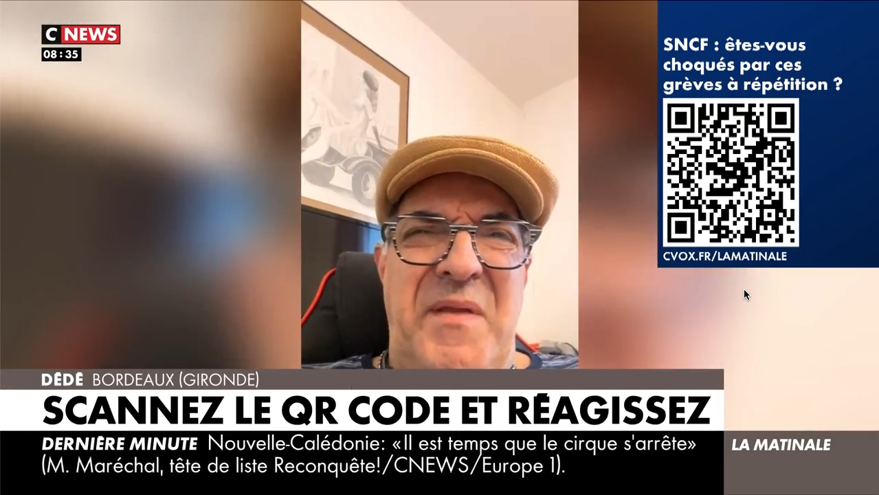 Et pour éviter les témoignages à l'eau tiède de BFMTV (oui, parce que c'est triste que Patrick ait perdu un petit quart d'heure, mais ça reste un petit quart d'heure), CNews a trouvé la parade : demander directement l'avis à ses fans, via un QR Code permettant d'envoyer un témoignage vidéo. Avec une question toute simple : "Est-ce que vous êtes choqués par ces grèves à répétition ? Est-ce qu'il y a deux France, une qui travaille, qui cherche à travailler parfois quand les autres les laissent se déplacer et une autre qui profite de sa position pour bloquer ?"