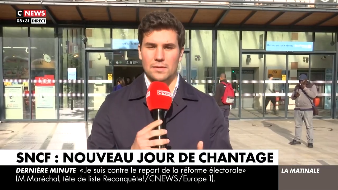 Ce jour-là, CNews avait aussi son envoyé spécial "gare" pour montrer aux téléspectateurs qu'il y avait moins de transports un jour de grève (scoop). Avec un bandeau aussi soft que la ligne éditoriale de la chaîne.