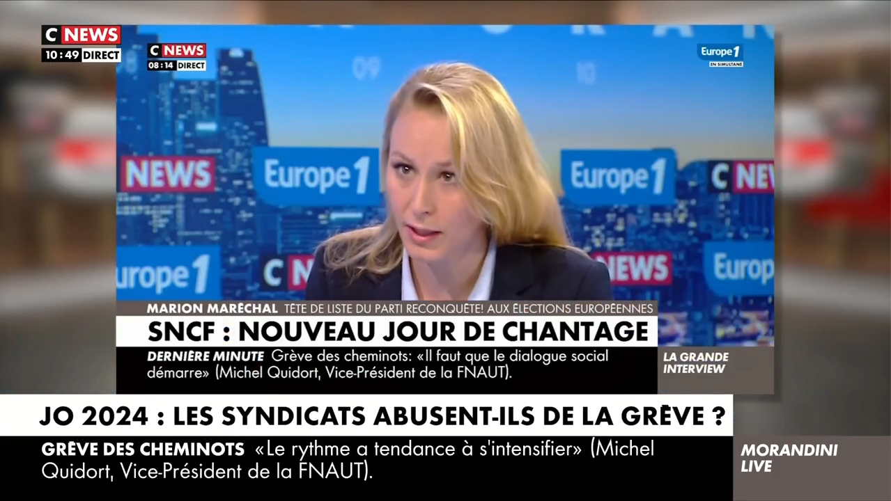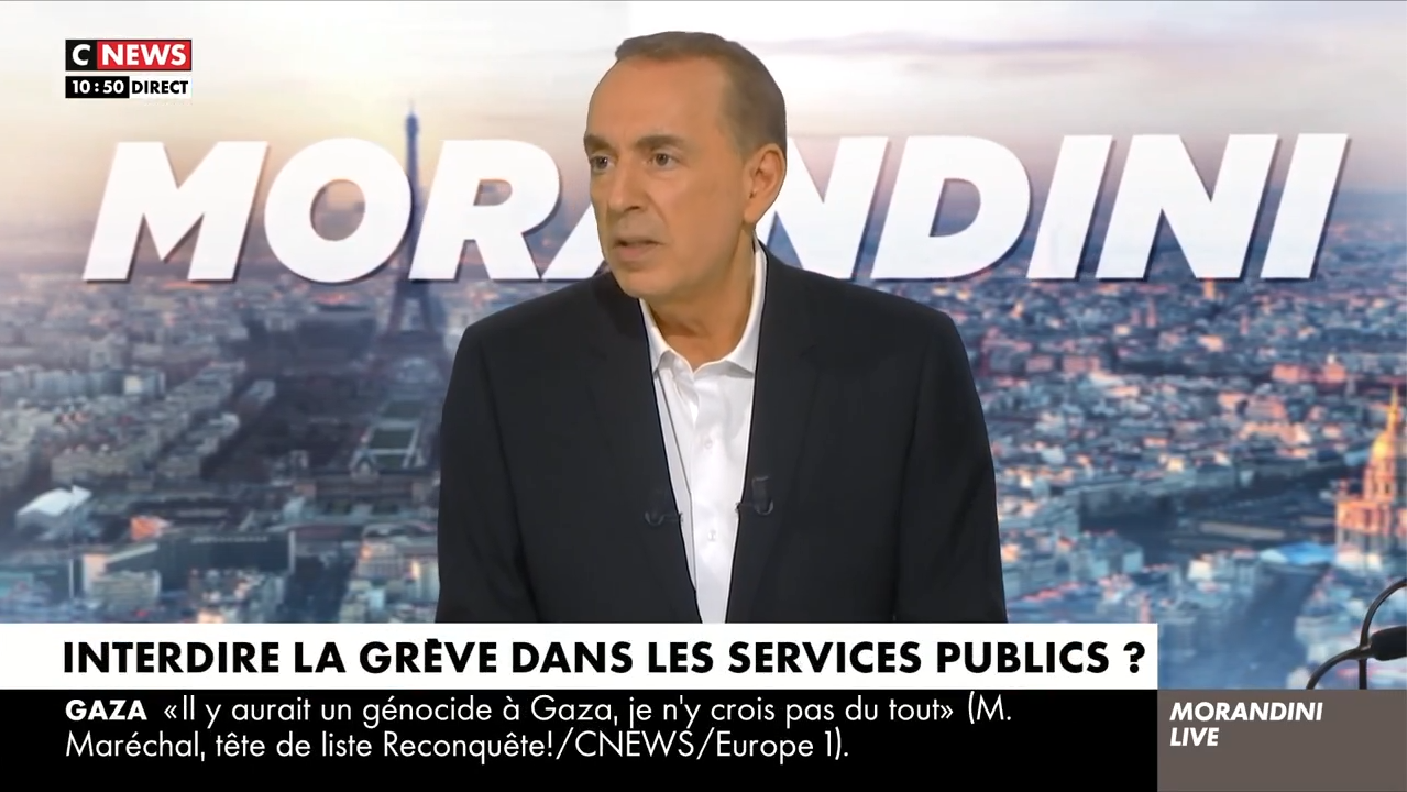 Pour Morandini, qui reprend la bonne idée du matin de Marion Maréchal, il faudrait tout simplement supprimer le droit de grève aux fonctionnaires : "C'est vrai que les Français en ont marre, ils en ont marre de ces grèves qui arrivent toujours avant les grands week-ends, qui arrivent toujours quand il y a des jours fériés pour se prolonger un petit peu les congés, voilà, il y en a marre, est-ce que la solution ce serait d'encadrer, voire elle parle même, à un moment donné, de supprimer carrément ces jours de grève pour la fonction publique ?"