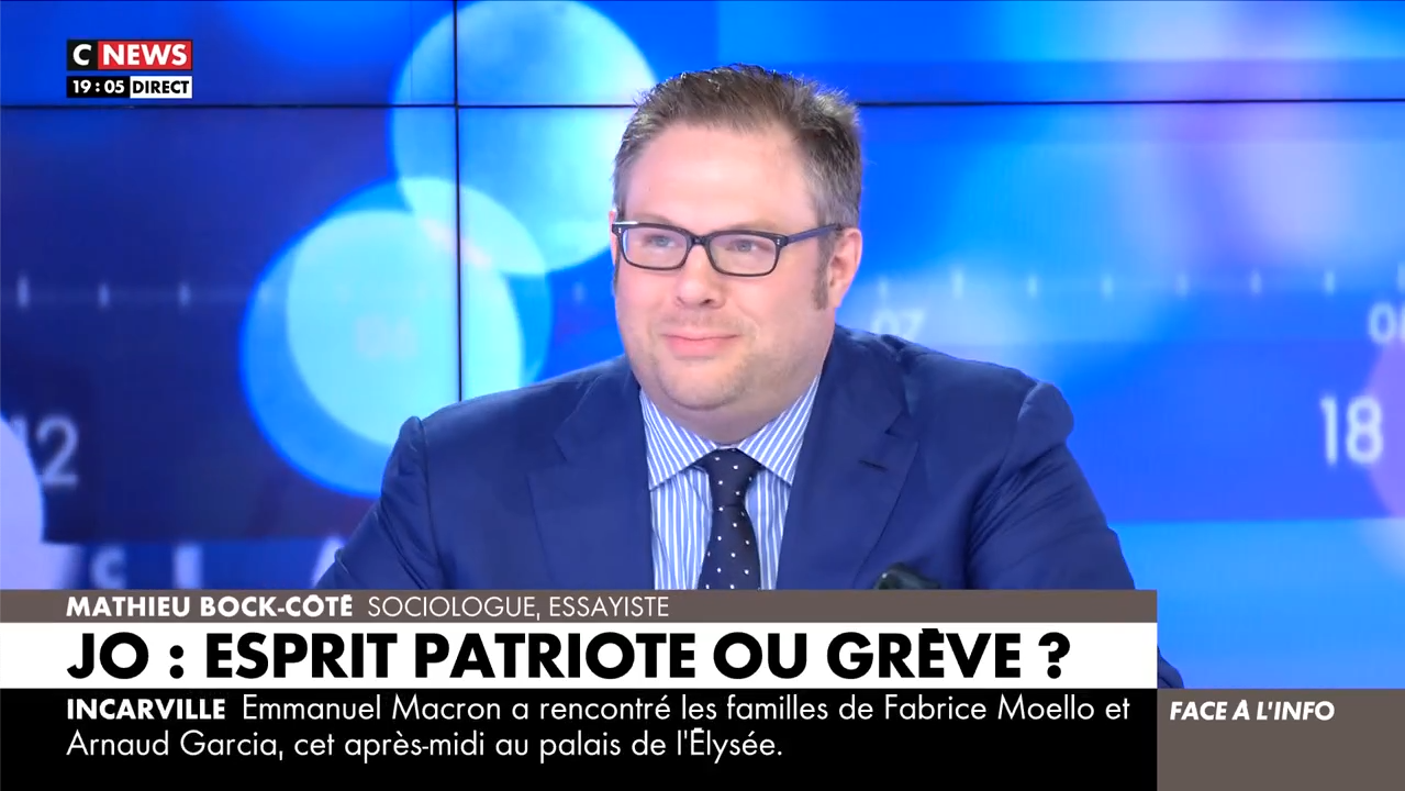 Pour Mathieu Bock-Côté, faire grève, c'est carrément anti-patriotique : "Les syndicats aujourd'hui imposent des grèves à répétition, prennent en otage les services publics, les détournent à leur avantage, les privatisent pour des conflits idéologiques. De ce point de vue, il y a probablement quelque chose de contradictoire dans la perspective des JO entre la culture de la grève obsessive et le patriotisme."