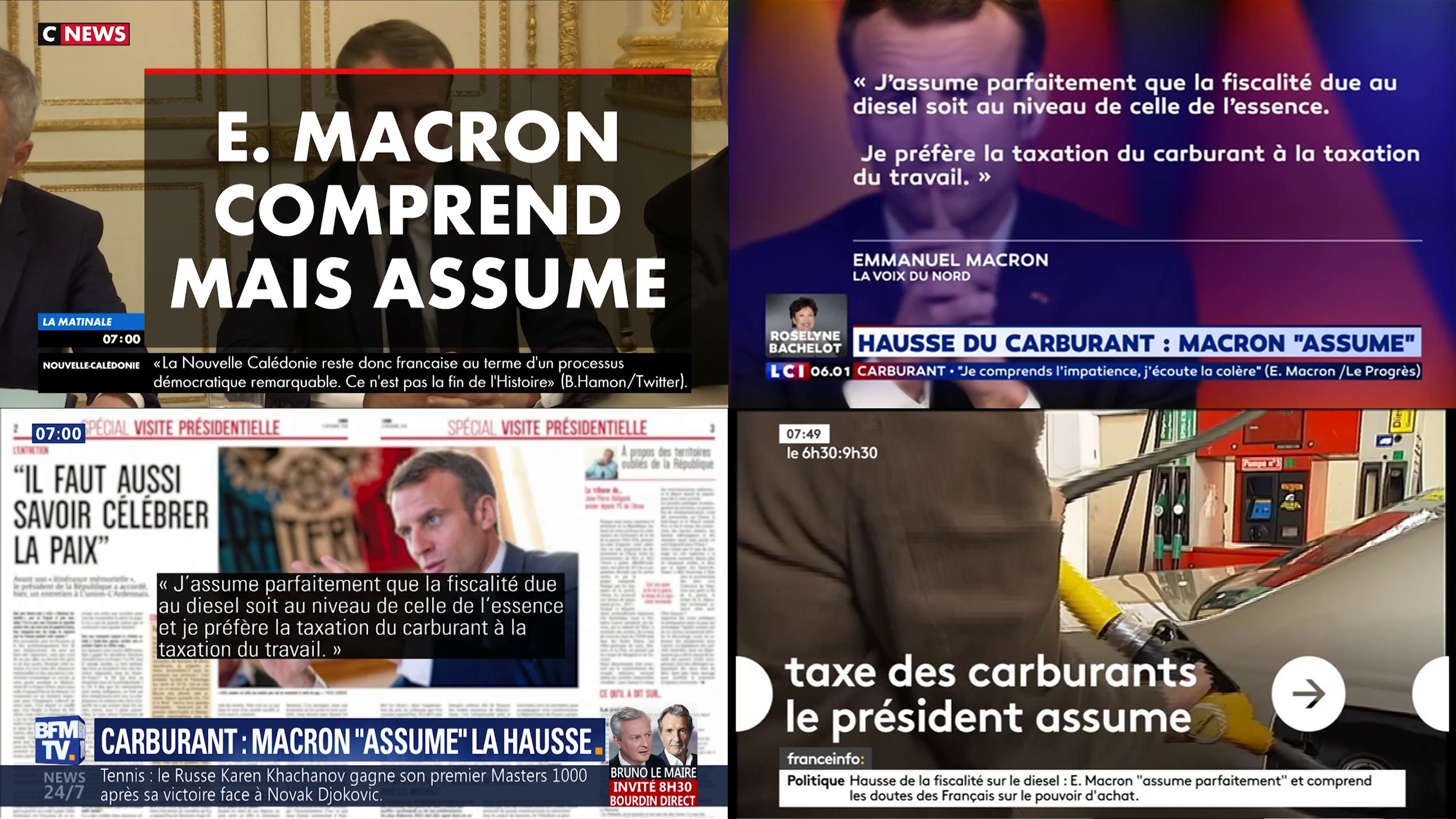 Reste le cas de Franceinfo. S'intéressant davantage au centenaire de 14-18, aux Midterms et au référendum en Nouvelle Calédonie, la chaîne du service public a peu traité cette histoire de carburant. Elle n’a pas parlé de la “colère” des “Français”, n’a pas diffusé en boucle le message de Jacline, ni de micro-trottoirs. Pas d’envoyés spéciaux non plus dans les stations service. Il n'y a eu qu'un seul sujet sur la hausse du prix des carburants, plutôt factuel : la chaîne évoque la contestation des "gilets jaunes" (ces automobilistes mécontents) et les réponses du gouvernement face à ce mouvement.