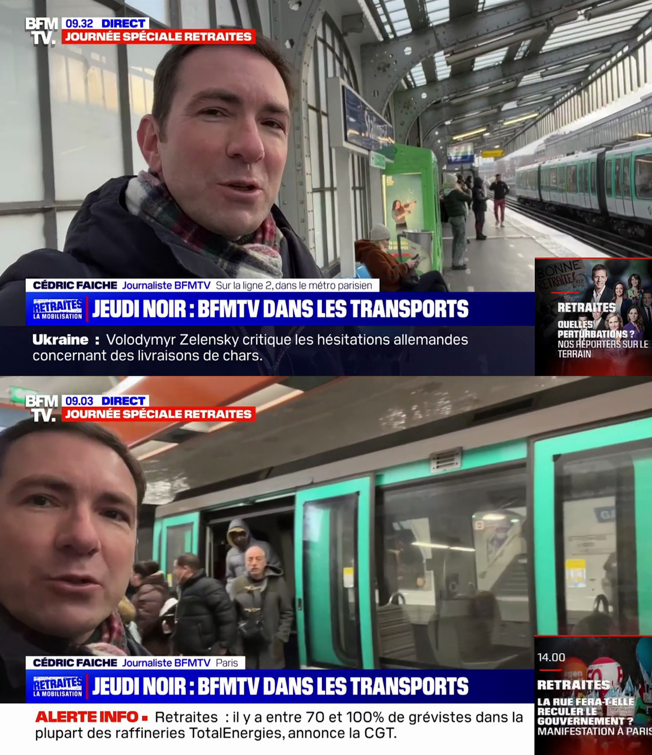 Le jour J, BFMTV a envoyé ses deux reporters de choc, Cédric et Ashley (que vous connaissez bien puisqu'ils avaient couvert avec brio les obsèques d'Élisabeth II). Et à chacun de leurs duplex, ils témoignaient de la galère dans les transports… avec des métros qui circulaient en arrière-plan.