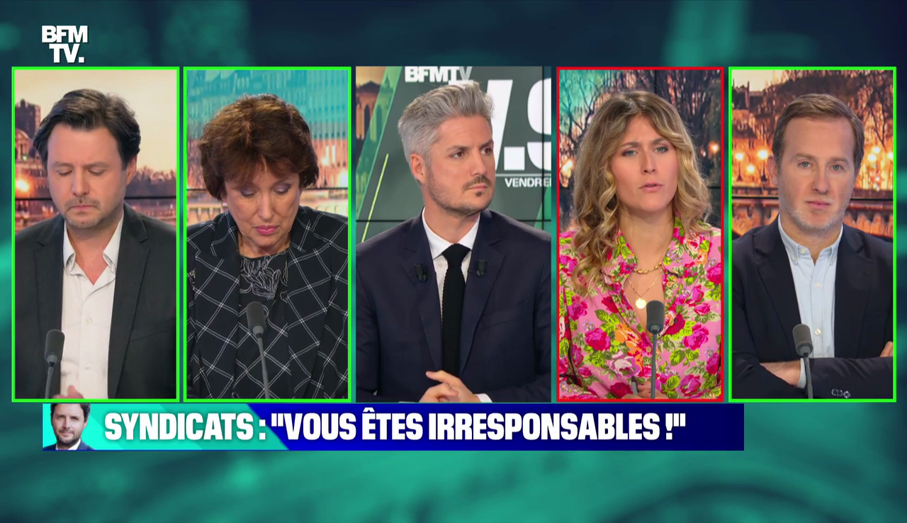 Dans l'équipe des verts, il y avait notamment l'ancienne ministre de la culture, Roselyne Bachelot. Elle aussi, elle était particulièrement remontée contre les futurs grévistes : "On entraîne dans le mouvement des gens qui peut-être n'ont pas envie du tout d'arrêter de travailler mais qui y sont contraints par des gens qui les forcent à ne pas travailler, qui dérangent des personnes âgées qui ont des rendez-vous chez le médecin […] et ça c'est intolérable"