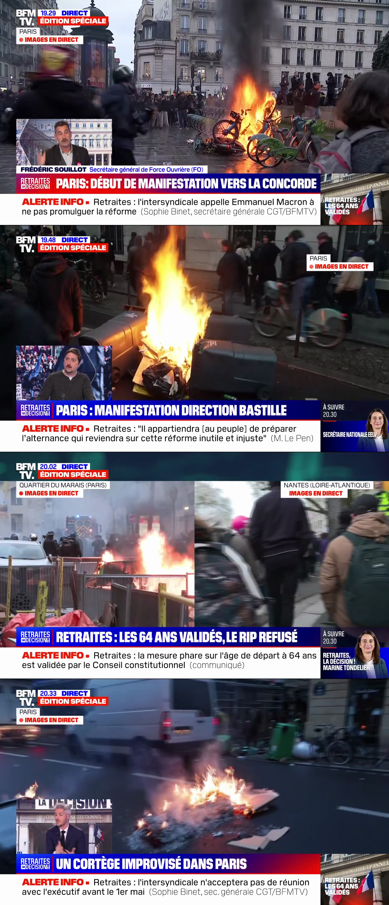 Dans ce flux continu, on n'est jamais à l'abri d'un moment d'égarement. Après la validation de la réforme par le Conseil constitutionnel, Dominique Rizet, l'éditorialiste police-justice qui dégaine plus vite que son ombre, a eu un moment de faiblesse à 21 h 06 : "Nous, journalistes, il ne faut pas qu'on en rajoute. On a vu des feux de poubelle, on a vu des poubelles renversées, on a vu des groupes de personnes qui marchaient dans Paris mais on est loin d'une émeute, les choses se passent plutôt bien, il ne faut pas laisser dire n'importe quoi."