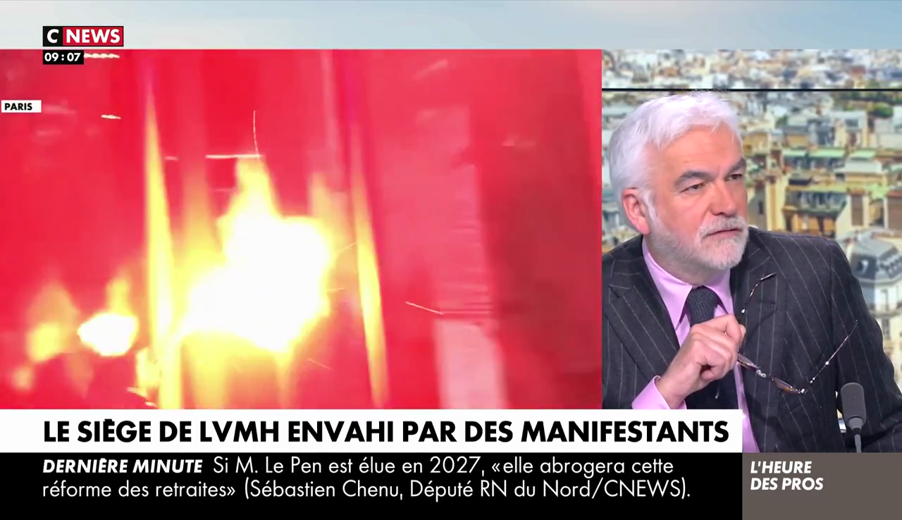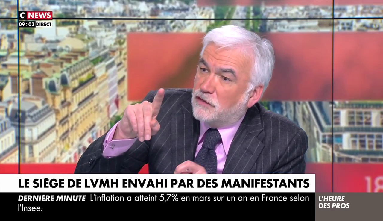 A priori, ça n'a pas suffi pour retourner l'opinion. Alors CNews en a remis une couche avec des éléments de langage sortis tout droit du service de communication de LVMH. Ce vendredi 14 avril, Pascal Praud a bien potassé les chiffres : "Je voudrais dire aux manifestants qui sont entrés hier dans le siège de LVMH que le groupe de Bernard Arnault n'est pas le problème pour la France",