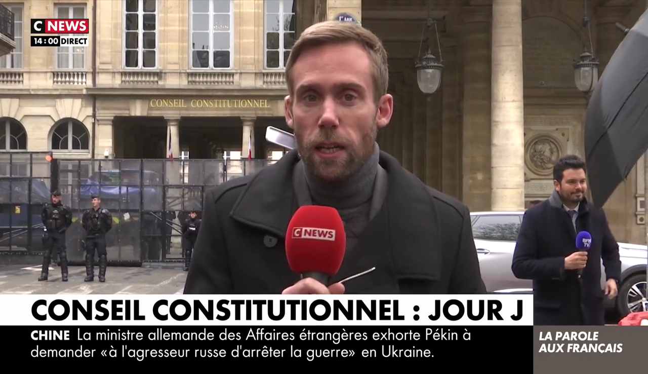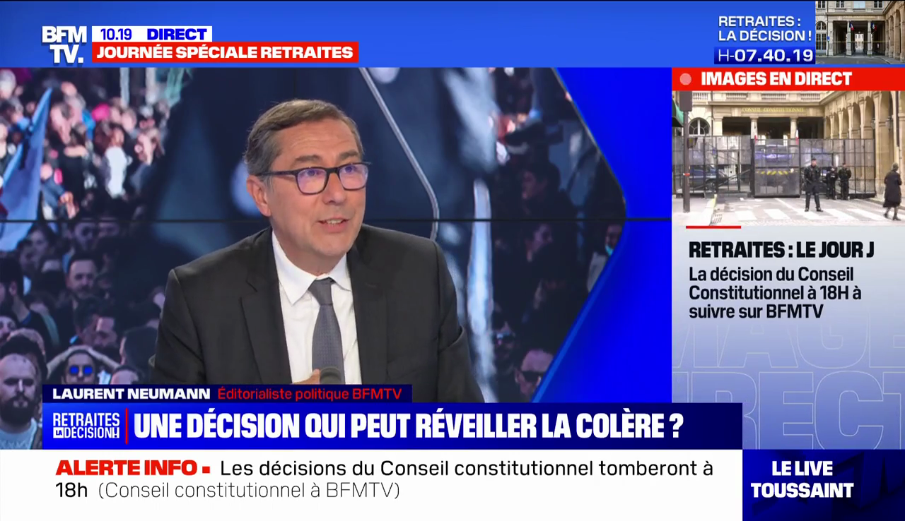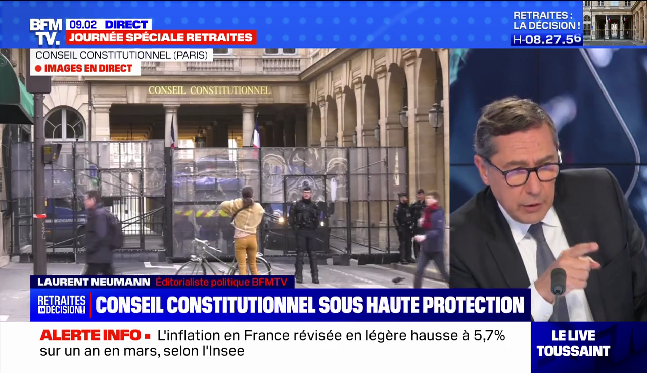 Sur le plateau de BFMTV, au cours de la journée, c'est l'éditorialiste Laurent Neumann qui est à la manœuvre pour délivrer de l'analyse au kilomètre. Le Conseil constitutionnel est bunkerisé et gardé par les CRS ? Daniel Schneidermann y perçoit un naufrage annoncé…