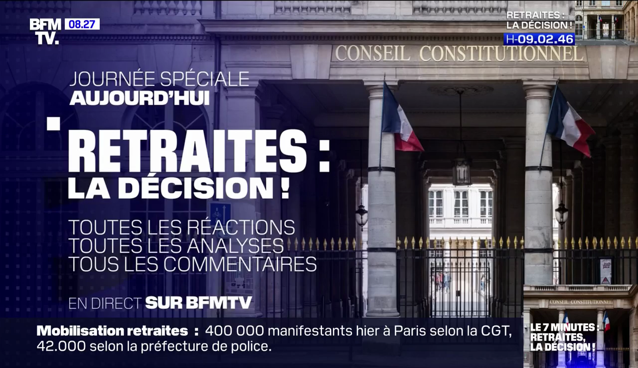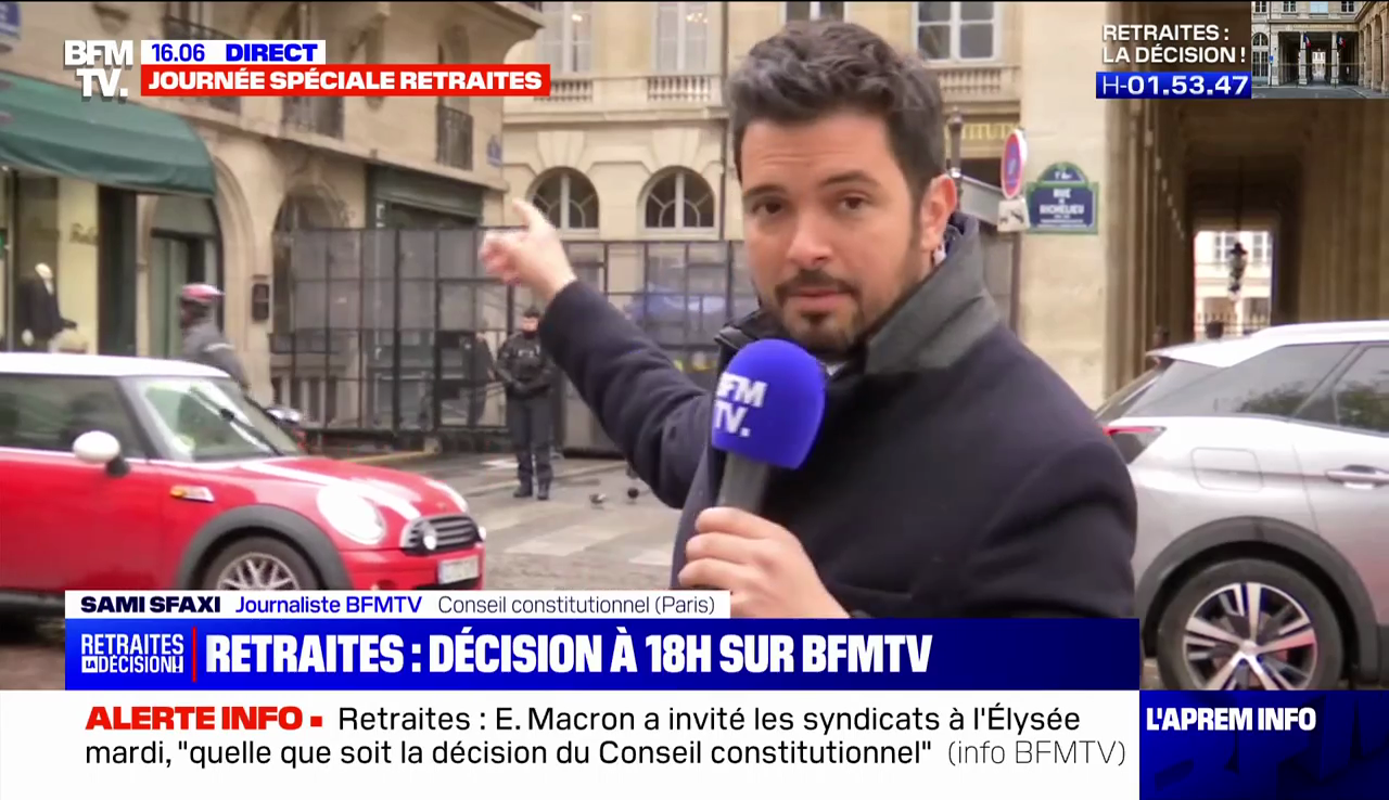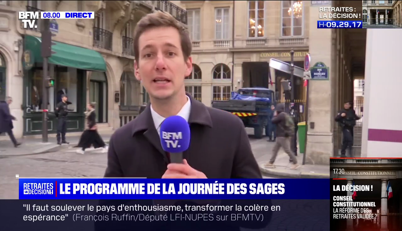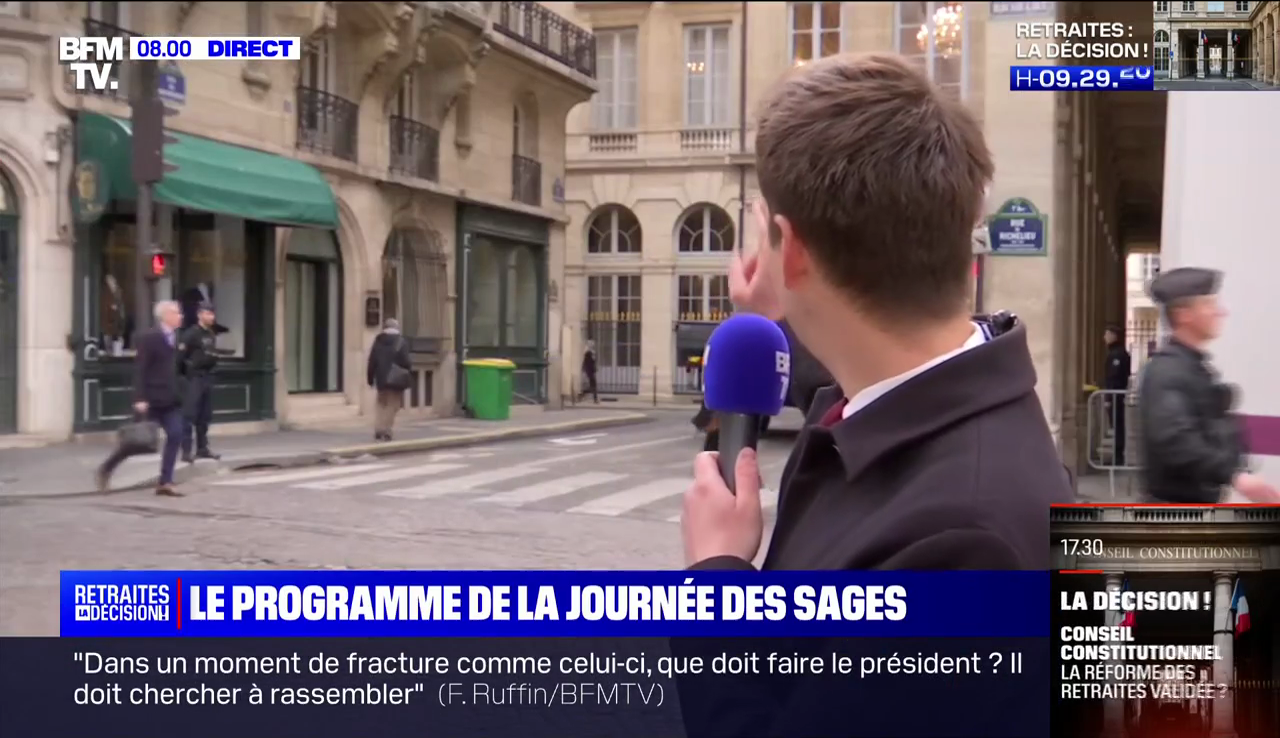Sur le plateau de BFMTV, au cours de la journée, c'est l'éditorialiste Laurent Neumann qui est à la manœuvre pour délivrer de l'analyse au kilomètre. Le Conseil constitutionnel est bunkerisé et gardé par les CRS ? Daniel Schneidermann y perçoit un naufrage annoncé…