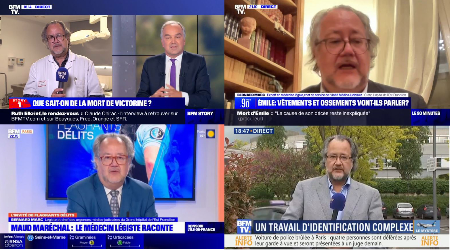 Il n'a évidemment pas procédé lui-même à l'autopsie, mais il a du temps Bernard, beaucoup de temps. Et il aime les caméras. Voilà pourquoi il apparaît dès qu'il y a un mort (après un meurtre, un crash d'avion, une découverte macabre).