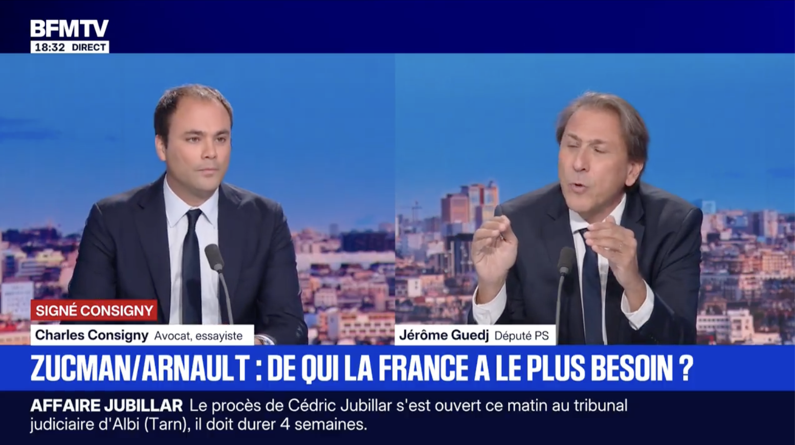 Depuis la sortie d'Arnault, tout n'est qu'une histoire de conflit, d'opposition. Finalement, Arnault et Zucman, ce sont deux France qui s'opposent, irréconciliables, la guerre civile économique, la sécession politico-sociale. Il faut voir avec quel aplomb BFMTV pose la question : "Arnault/Zucman, de qui la France a le plus besoin ?" que ce soit pour un édito d'Yves Thréard, ou dans un numéro de l'émission Marschall et Truchot. En plateau l'avocat Charles Consigny explique que c'est une "question rhétorique", et se désole que toutes les personnes qui ont soutenu la taxe Zucman n'aient jamais créé ni richesse ni emploi - ce qui est faux puisque des entrepreneurs de la Tech tout bien comme il faut se sont exprimés en faveur de cette taxe.
