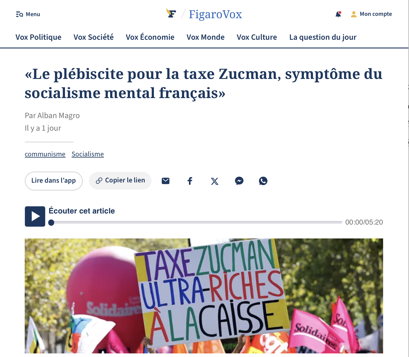 Une dérive sectaire voire une maladie mentale, mais on n'osera pas verser dans la pathologisation - par respect au moins, pour ceux qui en souffrent vraiment. Mais certains médias s'y risquent quand même, comme le Figaro, en première ligne de la fronde anti-Zucman : "Le plébiscite pour la taxe Zucman, symptôme du socialisme mental français", explique dans une tribune, un certain Alban Magro, favorablement présenté comme "chercheur associé à l'Institut Thomas More", énième think-tank libéral, qui permet aux médias, quand ils ont fini de faire les fonds de tiroir du haut management du CAC 40 pour défendre les intérêts du capital, de renouveler leurs plateaux.