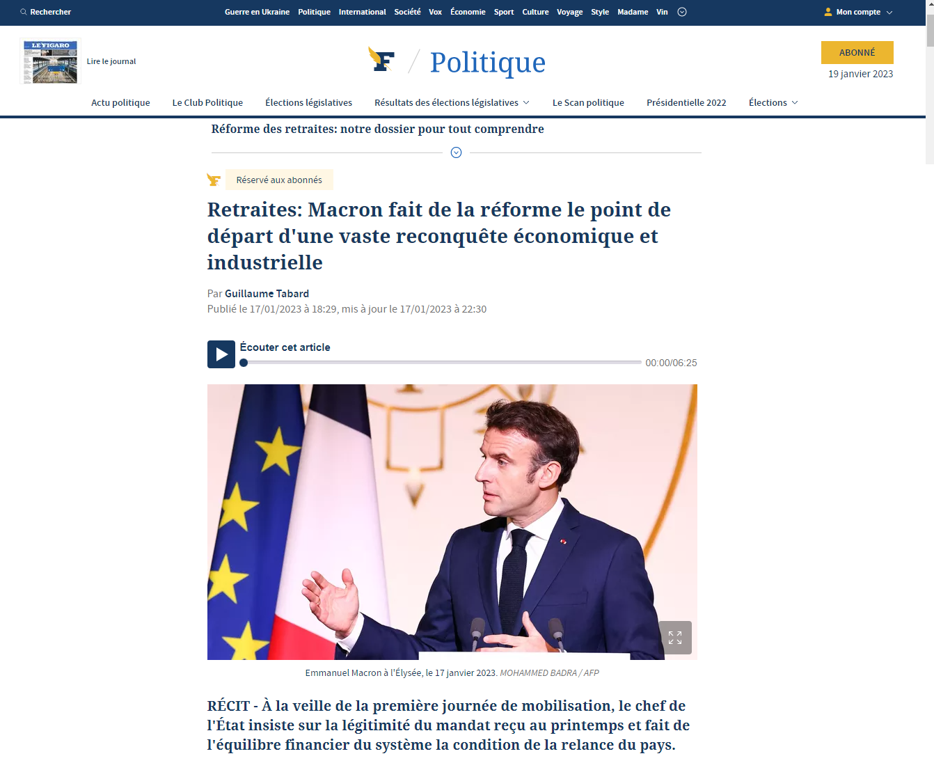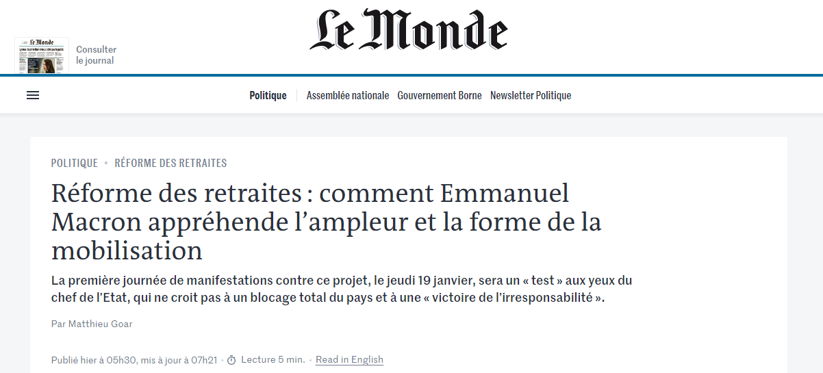 a été briefé par Macron, mais n'a pas jugé bon de l'expliciter à son lectorat. Car telle est la volonté présidentielle : "Dans la séquence qui s'ouvre, Macron ne montera pas nécessairement en première ligne. Il laisse Élisabeth Borne, ses ministres et sa majorité gérer le débat public. À ce jour, il n'a prévu aucune intervention particulière, solennelle ou télévisée."