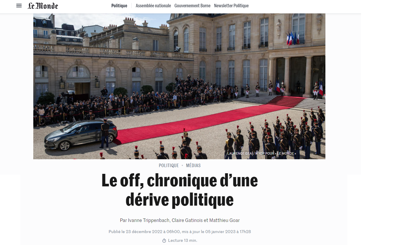 consacrait un long article au "off", décrit comme une "dérive politique". "La tenue de propos anonymes est devenue une véritable arme de communication sous la présidence d'Emmanuel Macron,"