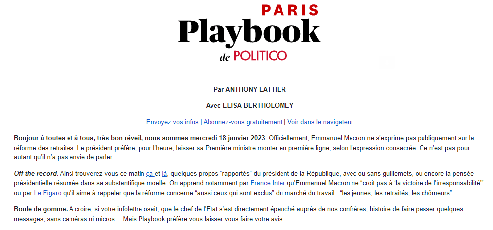 Tenter de contourner les règles du "off" présidentiel est désormais une habitude qui confine presque au jeu pour l'équipe parisienne de la lettre confidentielle nouvelle génération qu'est le média anglo-saxon Politico. En septembre dernier, nous vous racontions comment sa newsletter Playbook Paris avait brisé le "off" après une rencontre du président avec l'Association de la presse présidentielle, en développant la méthode dite de la citation sans guillemets : "Emmanuel Macron juge aussi efficace que la tête à Toto – l'expression n'est pas de nous – l'idée de taxer les jets privés au seul niveau franco-français."