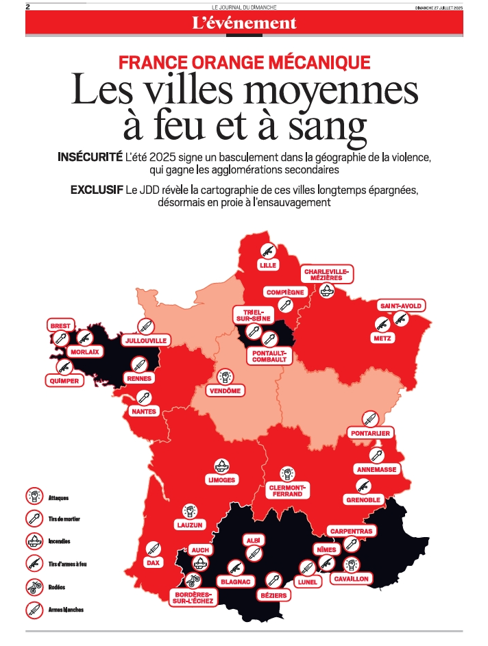 Pourtant, dix jours plus tard, Jullouville fait carrément la Une de l'édition papier du JDD daté du 27-28 juillet. La ville apparaît sur la carte de France d'un "été Orange mécanique", qu'a élaborée le journal de Bolloré pour montrer que la France des agglomérations secondaires est touchée par le chaos. Ceux qui ont vu le film de Kubrick apprécieront le sens de la nuance, ou du ridicule. Page 2, en regard de l'édito de Jules Torres , prend place en pleine page une seconde carte de France en rouge et noir (sans que ce nuancier soit explicité en légende). Le nom de la station balnéaire de 2500 habitants l'hiver (et dix fois plus l'été) figure parmi ces villes moyennes qui seraient "à feu et à sang" (selon le visuel de promo posté sur Facebook) et est assorti d'un pictogramme représentant un poignard.