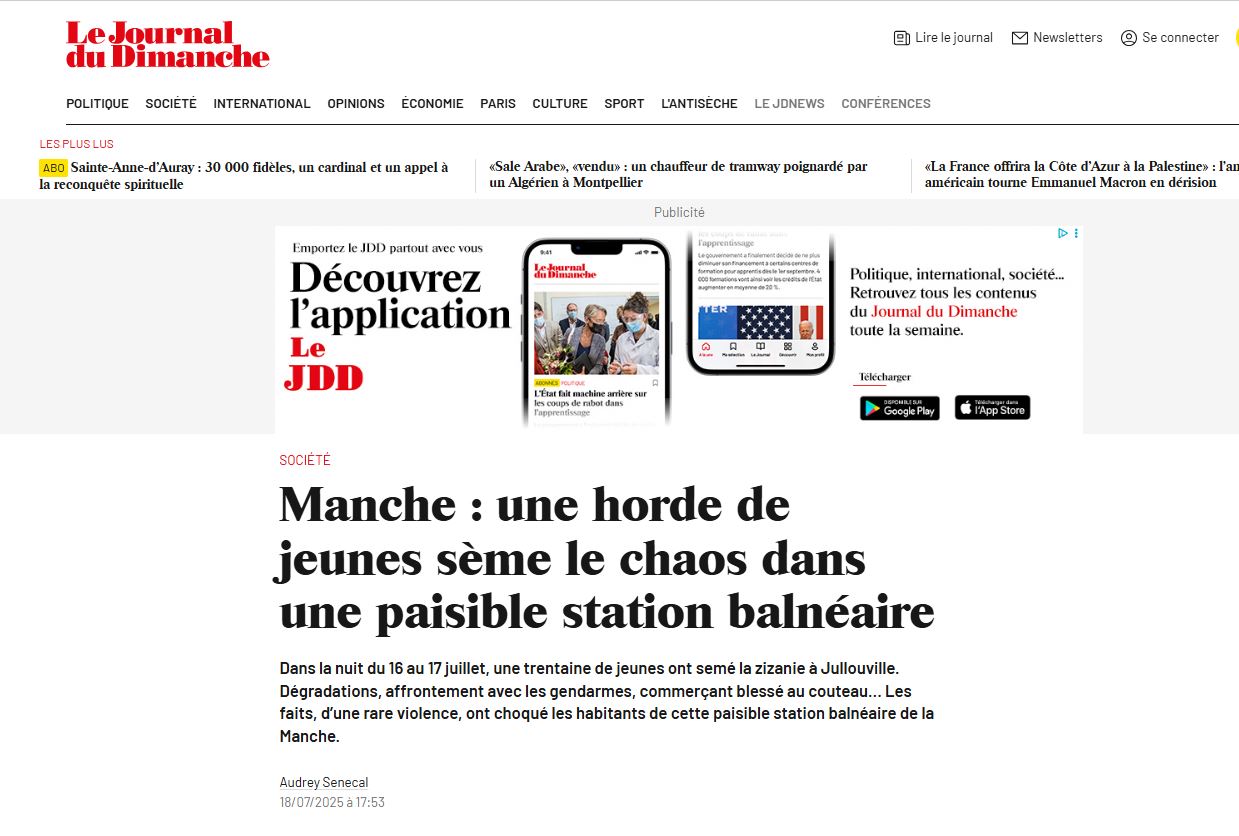 titre annonce la couleur de ce média de droite ou centre droit selon ses collègues belges : "L'affaire Jullouville, nouveau signe de l’insécurité croissante en France : le restaurateur agressé par une «meute» de jeunes témoigne".) C'est ainsi, également, qu'on entend Tugdual Denis, le directeur de la rédaction de Valeurs actuelles