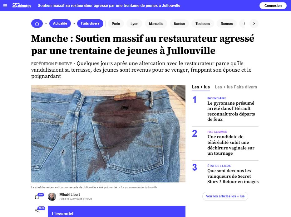 se fend d'un long article grandiloquent, titré "En Normandie, un restaurateur poignardé par une horde sauvage"