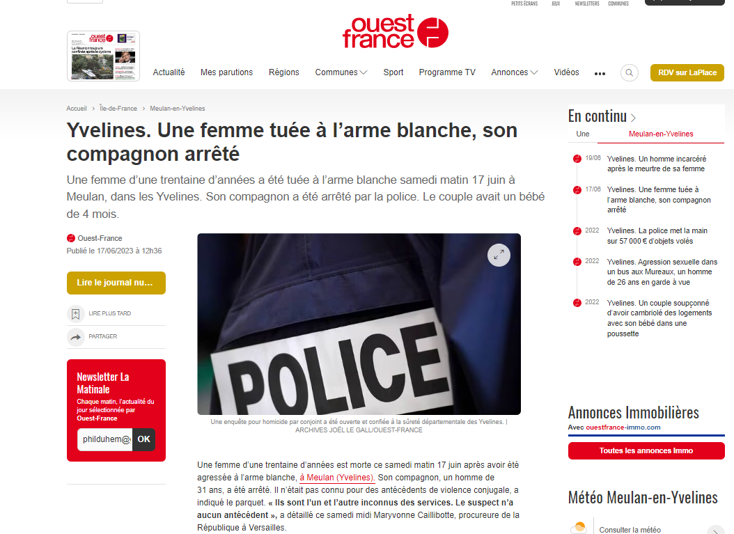 Parmi les 118 meurtres de femmes recensés par les associations en 2023, arrêtons nous sur Meulan. Une femme de 29 ans y est poignardée le 17 juin 2023 devant son bébé de quatre mois. Le fait est atroce, mais rien sur Europe 1