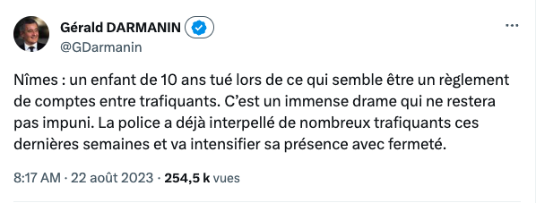 Un premier élément d'explication réside sans doute dans un tweet signé du premier flic de France. À 8 h 17 le 22 août, soit moins de dix heures après une fusillade qui a eu lieu après 23h, Gérald Darmanin tweete : "Nîmes : un enfant de 10 ans tué lors de ce qui semble être un règlement de comptes entre trafiquants. C'est un immense drame qui ne restera pas impuni. La police a déjà interpellé de nombreux trafiquants ces dernières semaines et va intensifier sa présence avec fermeté."