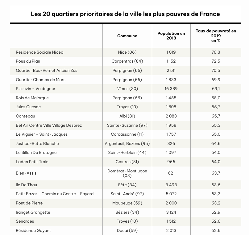Cela peut même alerter sur l'abandon d'une population qui compte parmi les plus pauvres de France, et depuis longtemps : les quartiers nîmois Pissevin et Valdegour, où sévissent les affrontements de truands dénoncés sur toutes les télés fin août, sont parmi les plus pauvres de France. Plus des deux tiers de leurs habitants (69,1%) vivent sous le seuil de pauvreté, indique l'Observatoire des inégalités. Et ces deux quartiers nîmois faisaient déjà partie des 22 secteurs où le ministère de l'Intérieur voulait mener en priorité la lutte contre la délinquance... en janvier 2004.