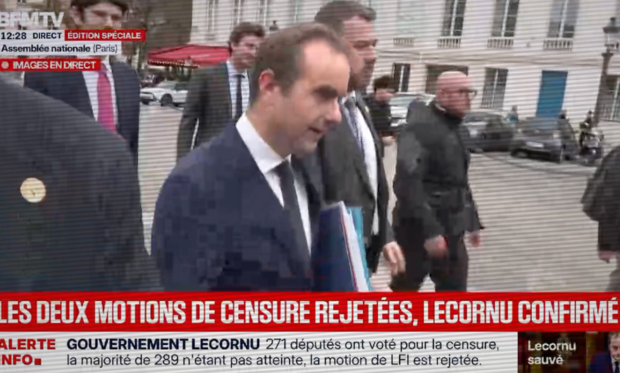 Il est 12h27, ce 16 octobre 2025, lorsque le Premier ministre Sébastien Lecornu, qui vient de "survivre" à une session parlementaire ayant rejeté deux motions de censure déposées contre lui (une par La France Insoumise, l'autre par le Rassemblement National), sort de l'Assemblée nationale sous le regard attentif de la caméra de BFM. "Les deux motions de censure rejetées, Lecornu confirmé" !, triomphe le bandeau de la chaîne d'info en continu. En plateau, la présentatrice Roselyne Dubois nous explique que Lecornu va désormais "rentrer à Matignon" : "Parce que, eh bien, il y a un petit peu de travail !", plaisante-t-elle.