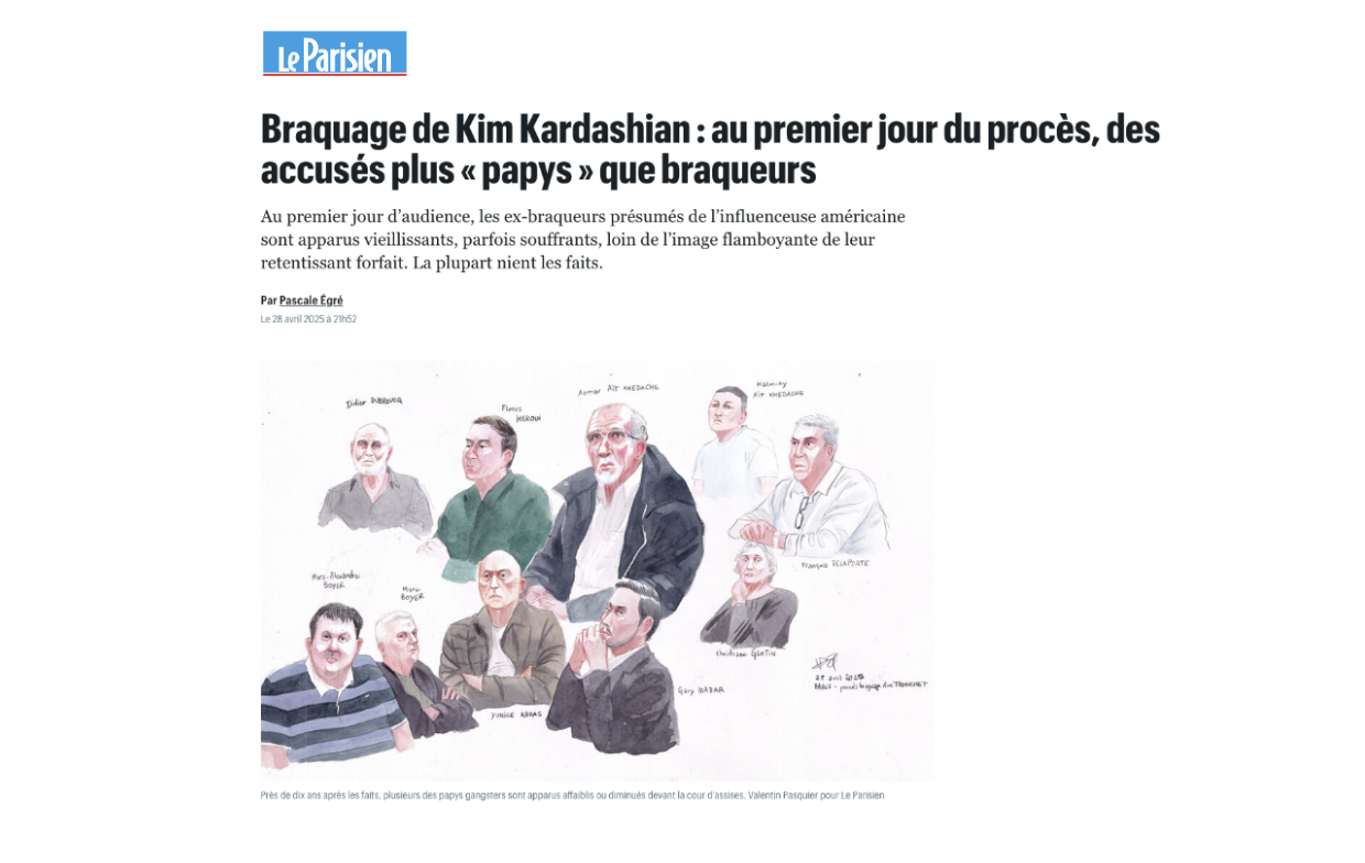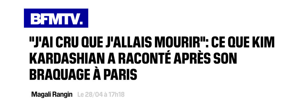 Dans les autres histoires de braquage, la presse parle de "malfaiteurs", de "préjudice", ils précisent : "aucun blessé n'est à déplorer" (le Parisien) ou emploient le vocabulaire du "saccage", de l'"attaque". Ils mettent parfois des citations des victimes en titre, car ça compte, les victimes (comme dans Sud Ouest : "« Il m'a regardé dans les yeux et m'a tiré dessus »"). Dans le cas du braquage dont a été victime Kim Kardashian, dont le procès a débuté le 28 avril à Paris, c'est une autre limonade.
