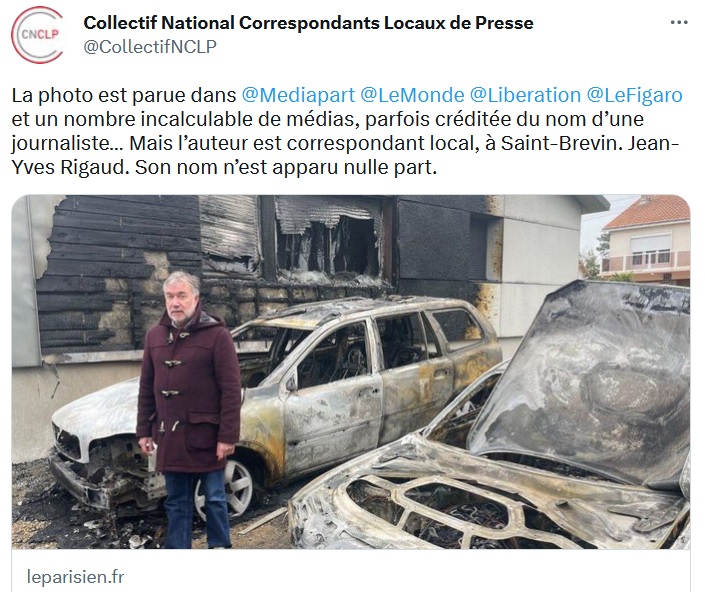 L'auteur de ces photos marquantes est prestataire indépendant, sans contrat ni protection sociale, comme plusieurs milliers d'autres dans toute la France – ces CLP produisent parfois la majorité des actualités locales publiées par la presse régionale. Ses deux photos, selon la grille des rémunérations des CLP d'Ouest-France, lui sont rémunérées 4 euros pièce… ainsi que 50 % des droits d'auteurs que rapporteraient des republications via la plateforme d'images MaxPPP. Comme avec ses journalistes, Ouest-France s'attribue 50 % des revenus de leur travail, donc, sans qu'ils aient le moindre droit en retour, même pas celui de pouvoir refuser ces republications, statut oblige. "La photo est parue dans Mediapart, le Monde, Libération, le Figaro et un nombre incalculable de médias, parfois créditée du nom d'une journaliste… Mais l'auteur est correspondant local, à Saint-Brevin. Jean-Yves Rigaud", a donc tenu à rappeler sur Twitter le Collectif national des Correspondants locaux de presse, déplorant comme je le faisais ci-dessus : "Son nom n'est apparu nulle part."