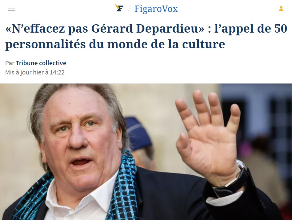 Ils et elles ont des trous dans la tête, mais pas pour les mêmes raisons qu'Orelsan. À moins d'envisager que ces 55 personnalités aient décidé de signer une tribune en soutien à Gérard Depardieu après une gueule de bois monumentale – tout étant possible en cette fin d'année 2023, n'éliminons pas totalement l'hypothèse. Après une quinzaine de témoignages et d'accusations circonstanciées d'agressions sexuelles. Après trois plaintes, pour "agression sexuelle" et "viol". Après des propos sexualisants à l'égard d'une fillette nord-coréenne, une accusation mensongère de manipulation lancée par la galaxie des médias Bolloré parvenue en quelques jours dans la bouche d'un président de la République désespérant de faire oublier sa loi immigration scélérate et indigne – ayant obligé une émission de service public, pour la première fois de mémoire de journaliste d'Arrêt sur images, à faire regarder ses rushs par un commissaire de justice.