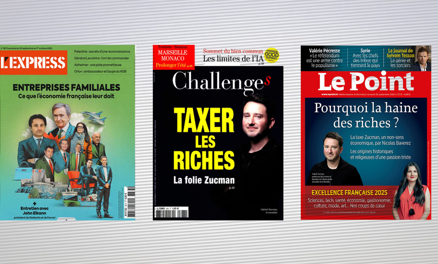 La semaine du 25 septembre, les hebdos de droite ont, semble-t-il, participé à une grande conférence de rédaction collective. Une seule ligne édito : à bas la taxe Zucman ! "Taxer les riches : la folie Zucman" (Challenges, 14 pages) ; "Pourquoi la haine des riches ?" (Le Point, 14 pages) ; "Entreprises familiales : ce que l'économie française leur doit" (L'Express, 10 pages) : ils étaient au diapason.